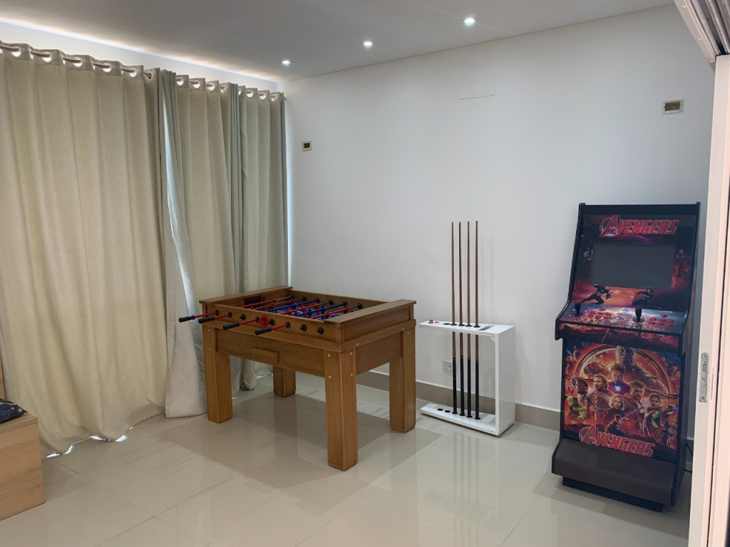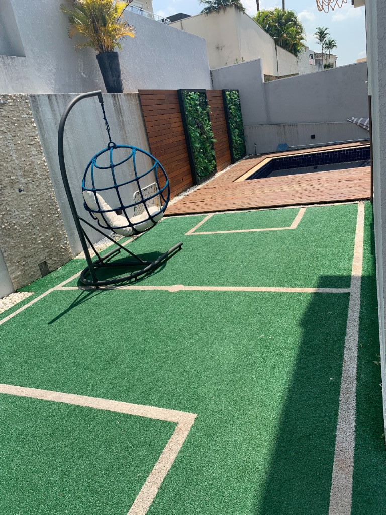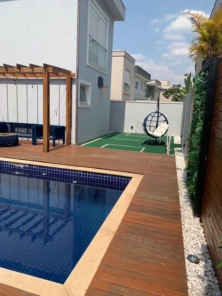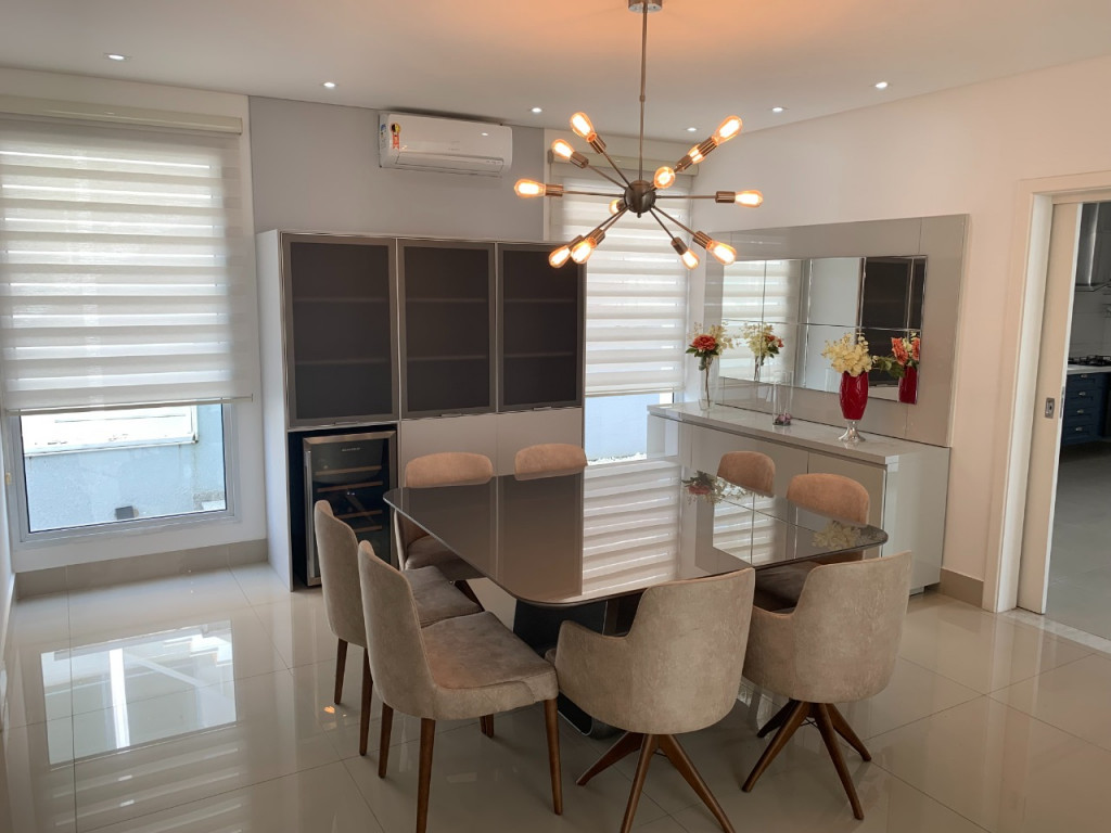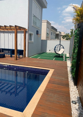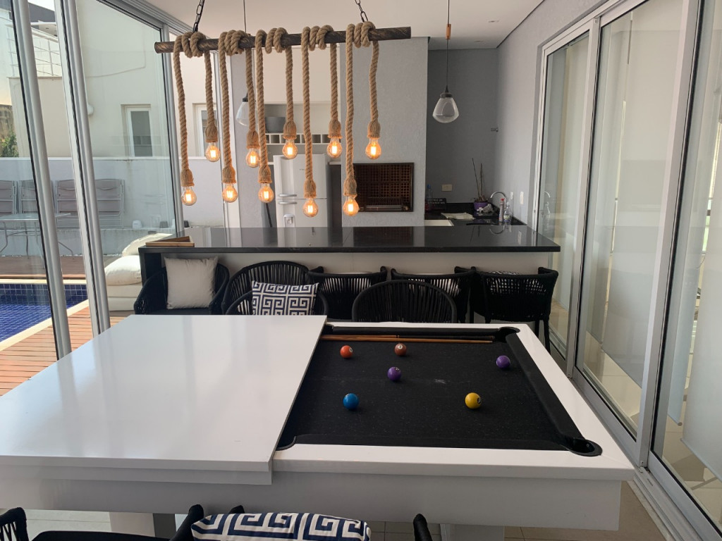 Casa de condomínio em Alphaville, no Burle Marx com 4 suítes (sendo a suíte master com banheira). Possui cozinha, sala de jantar, sala de estar, sala de jogos, sala de TV, pequeno terraço, suíte de funcionária, depósito na garagem, jardim de inverno na entrada inferior da casa, elevador, garagem para 6 carros( sendo 3 cobertas), piscina aquecida, deck de madeira, mini campo de futebol, área gourmet com geladeira, mesa de sinuca e canil.