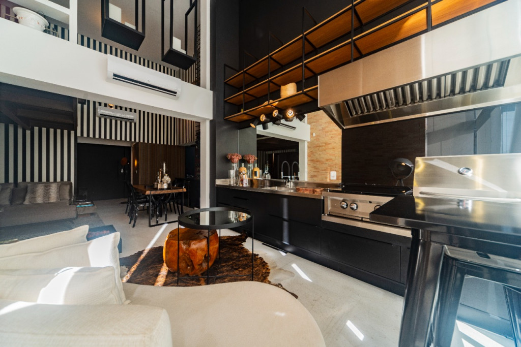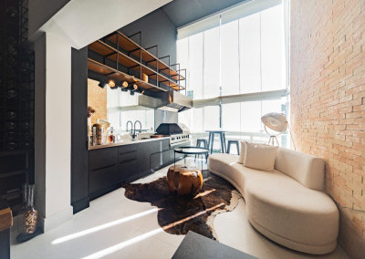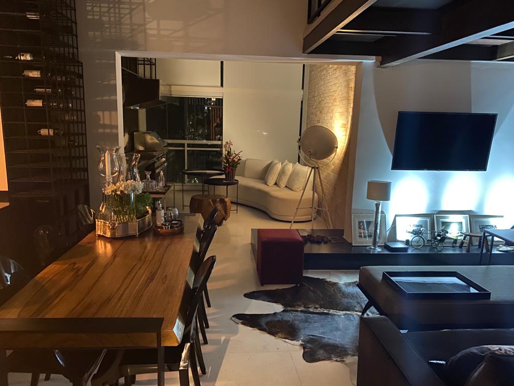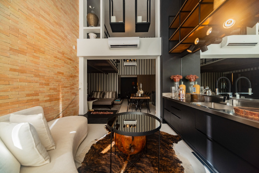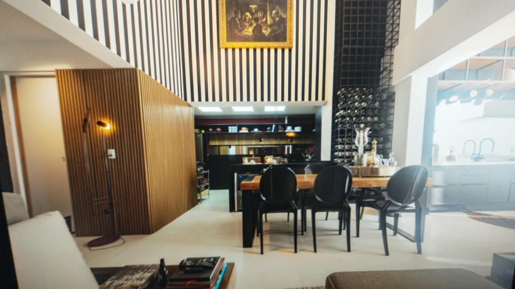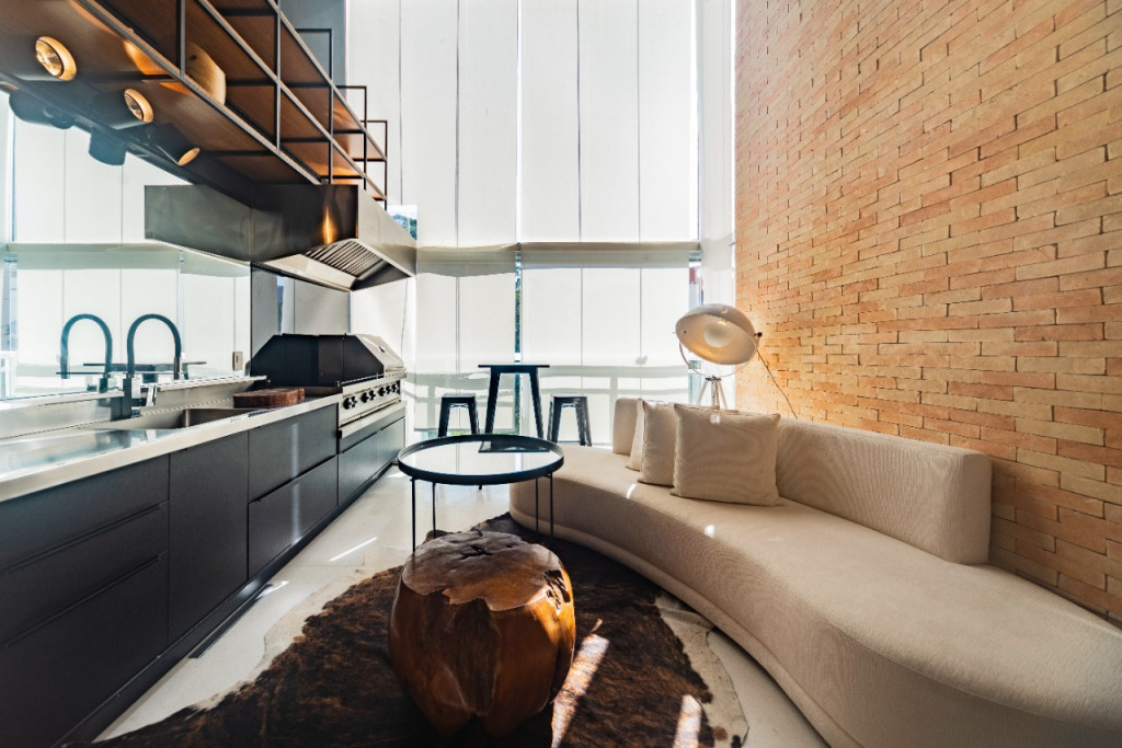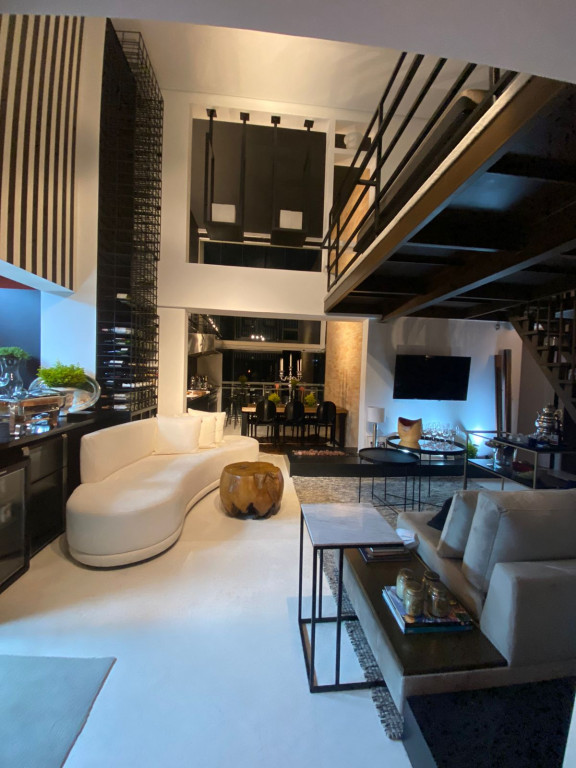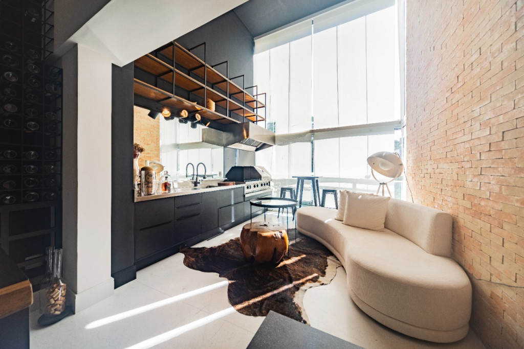 Apartamento de 149m² com muita iluminação natural e ventilação, por conta do terraço e do living com pé-direito de 5,2 metros e um mezanino, além das janelas amplas.