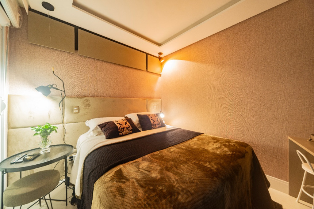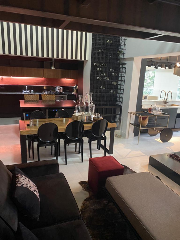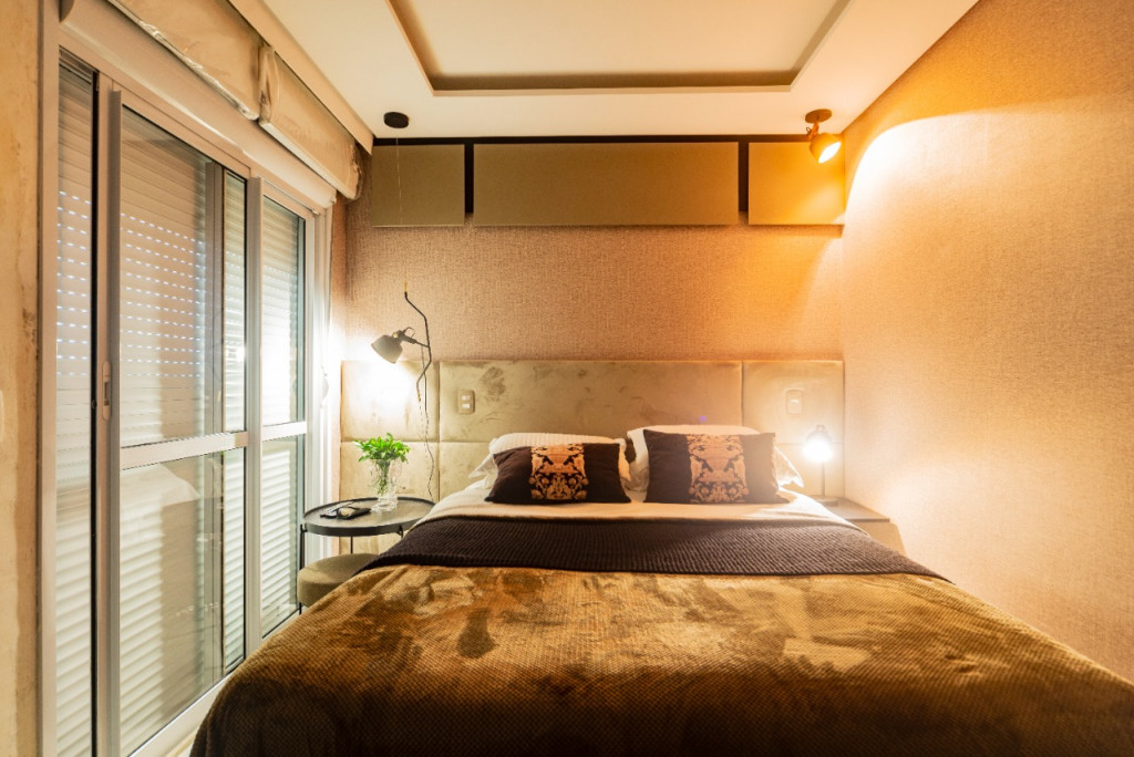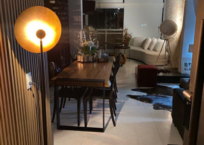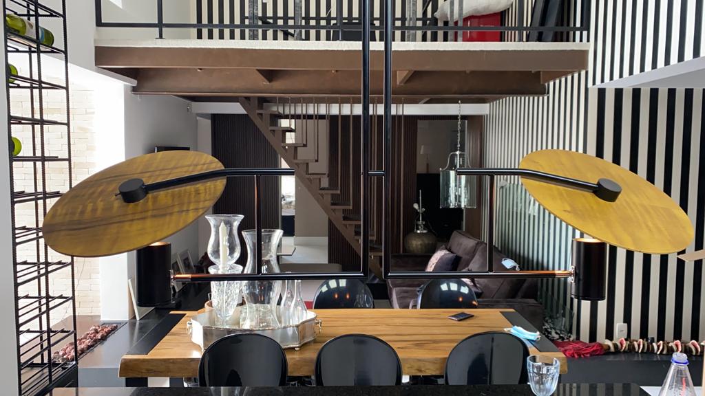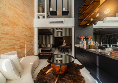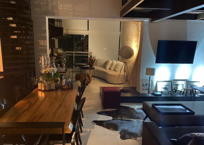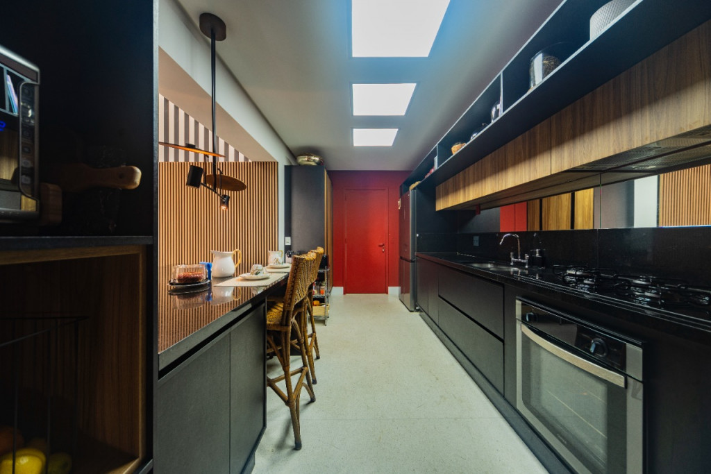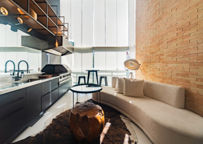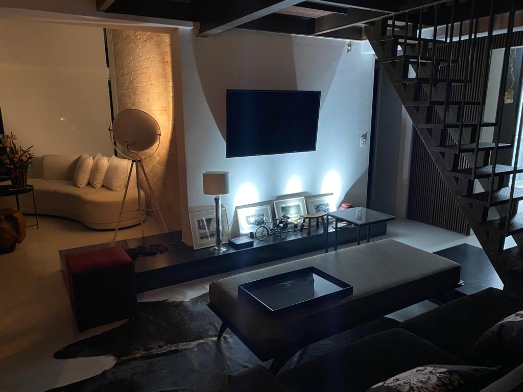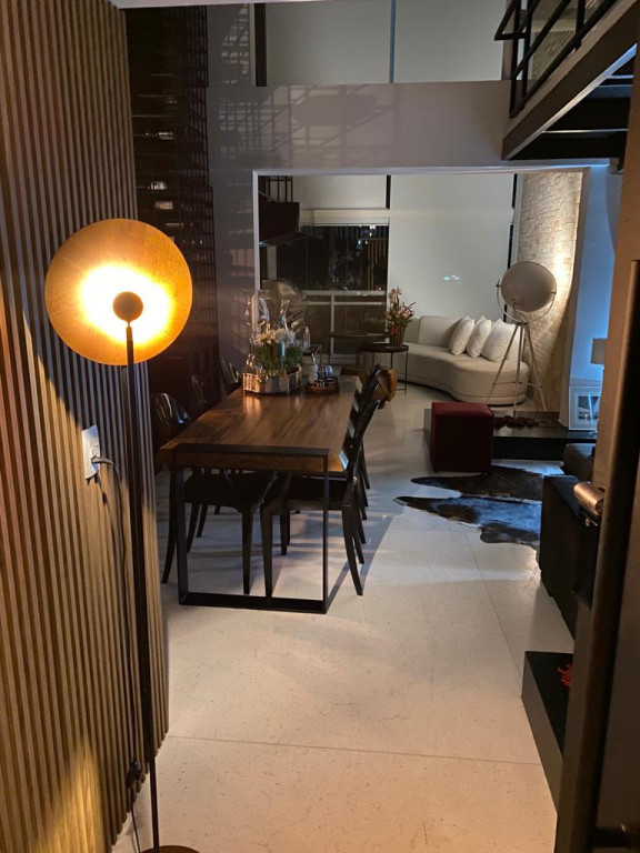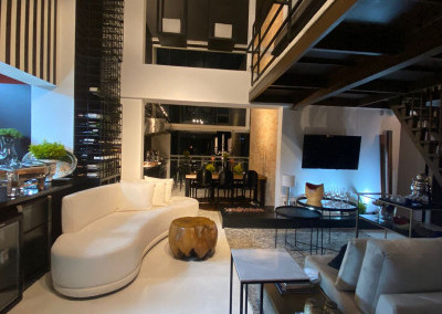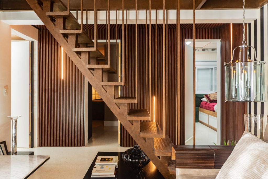 Apartamento de 149m² com muita iluminação natural e ventilação, por conta do terraço e do living com pé-direito de 5,2 metros e um mezanino, além das janelas amplas.