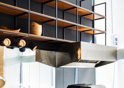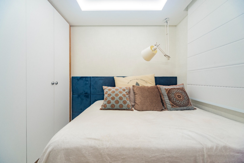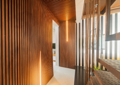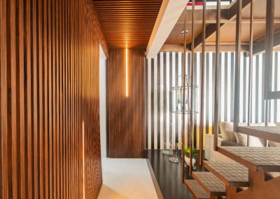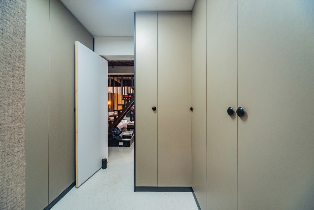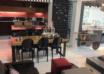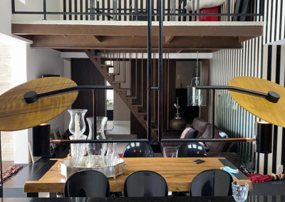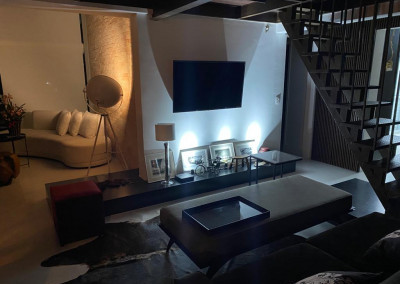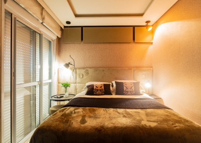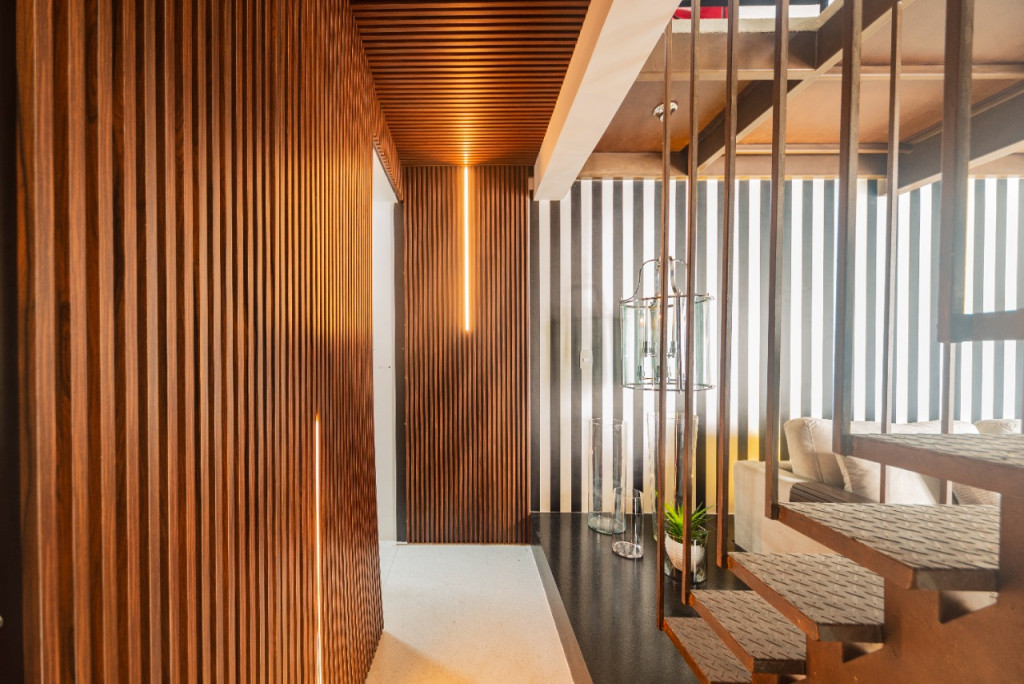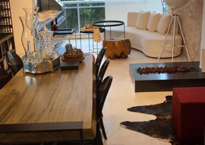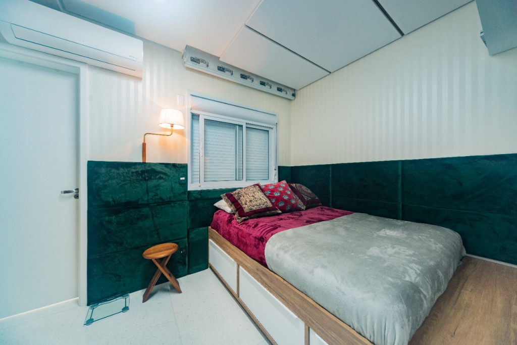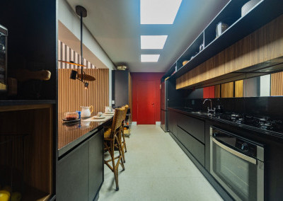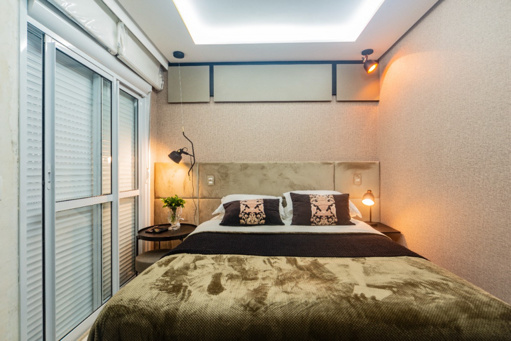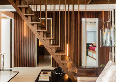 Apartamento de 149m² com muita iluminação natural e ventilação, por conta do terraço e do living com pé-direito de 5,2 metros e um mezanino, além das janelas amplas.
