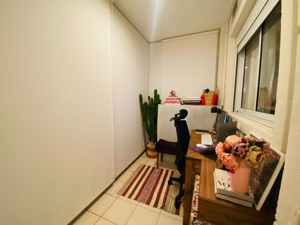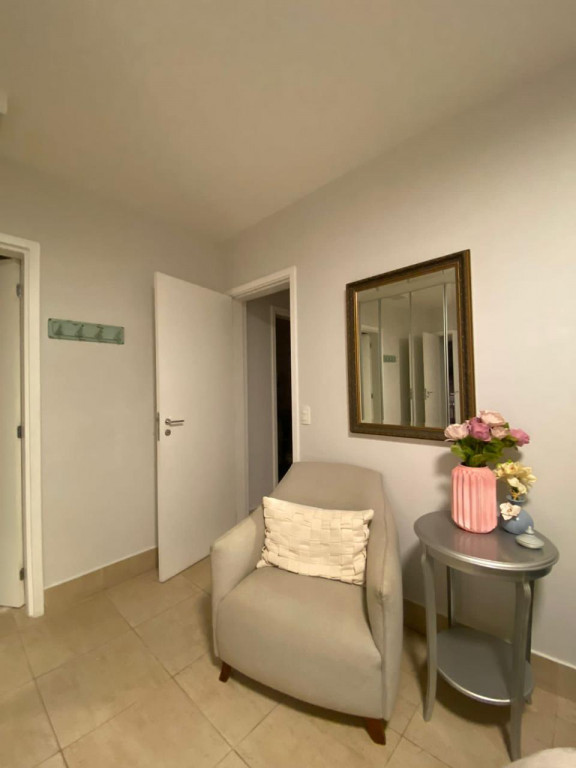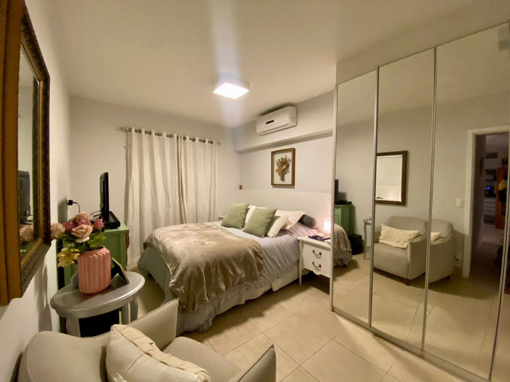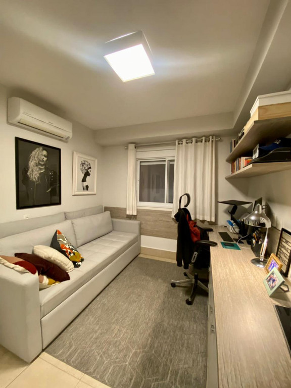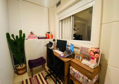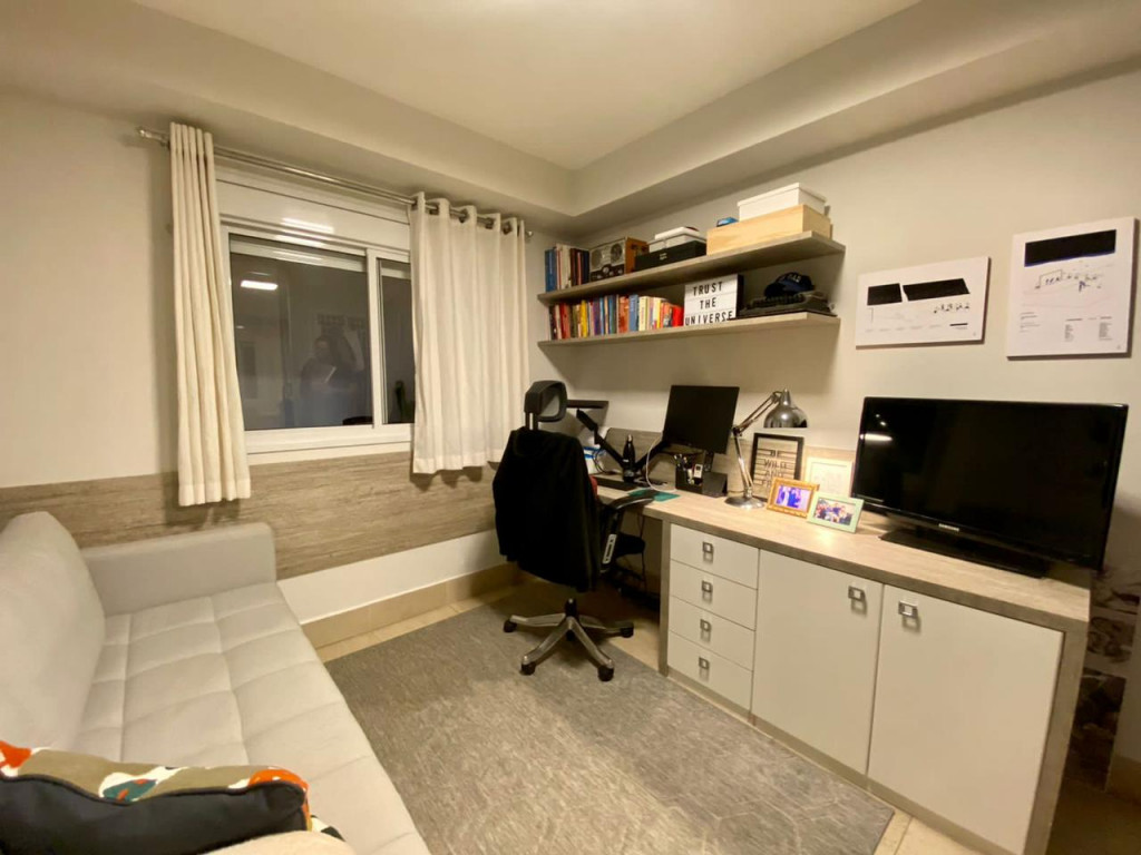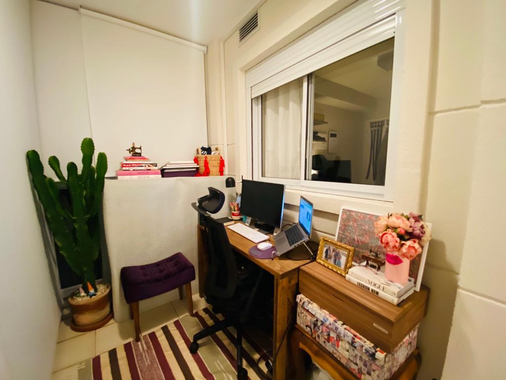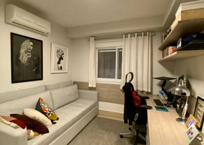 Armários planejados em todo o apartamento, varanda integrada ao living, com fechamento de vidros e cortinas blackout.