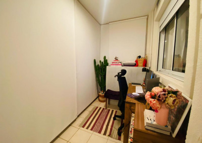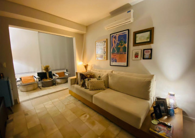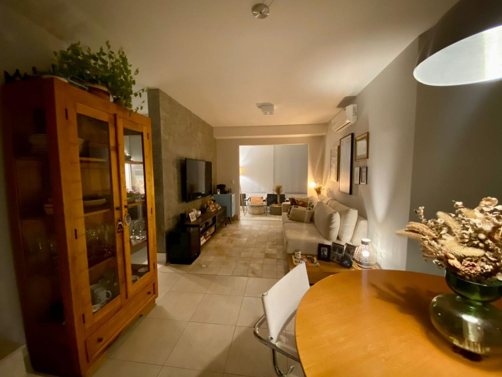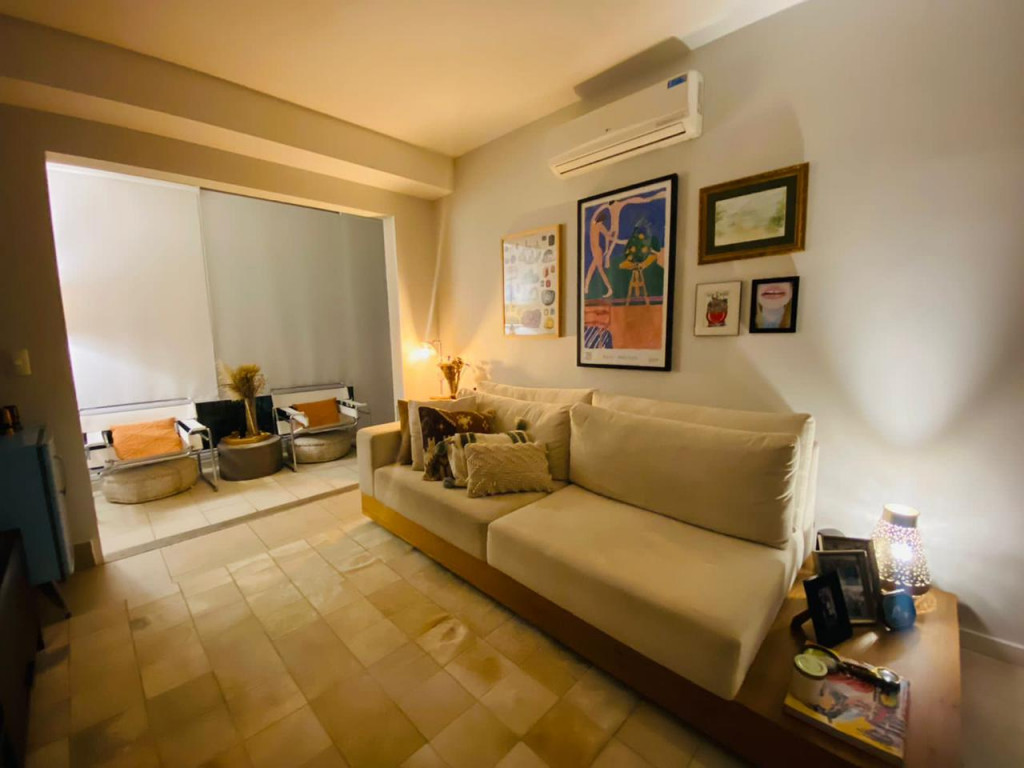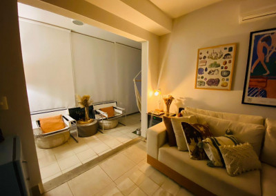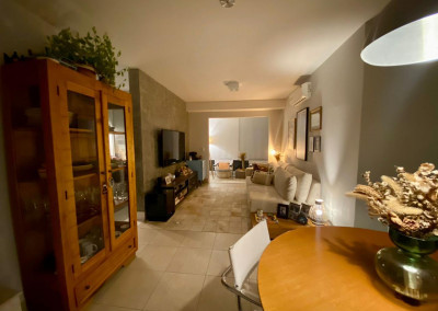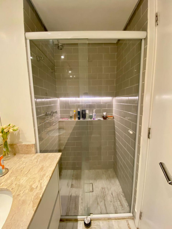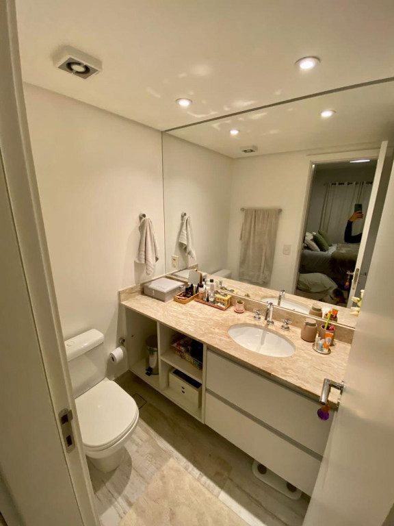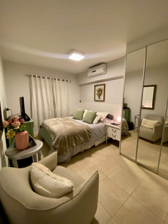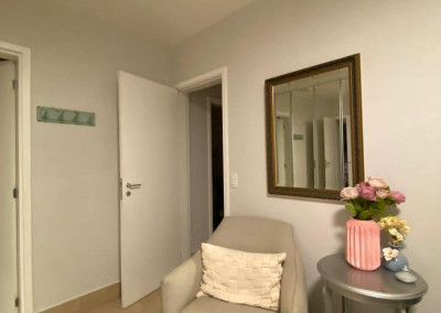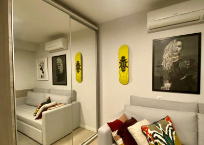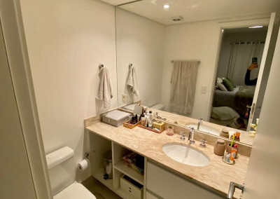Armários planejados em todo o apartamento, varanda integrada ao living, com fechamento de vidros e cortinas blackout.