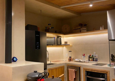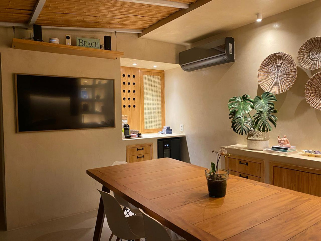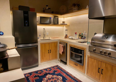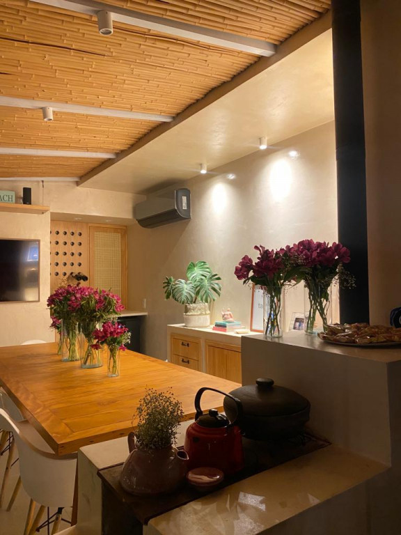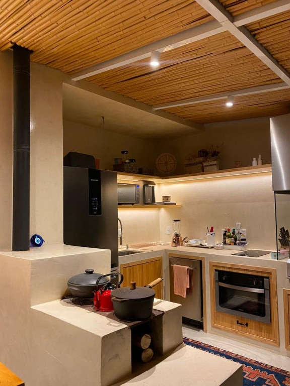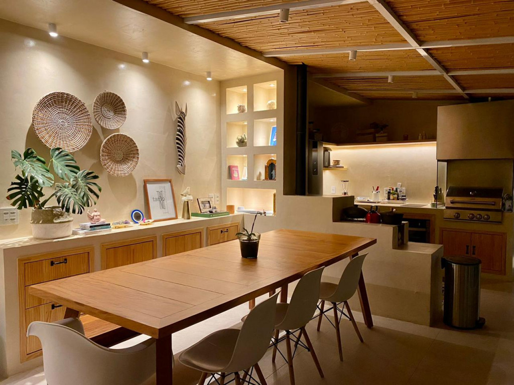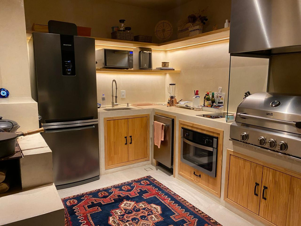 O espaço gourmet no andar superior está equipado com Adega seca, Coifa, churrasqueira, fogão e cooktop.