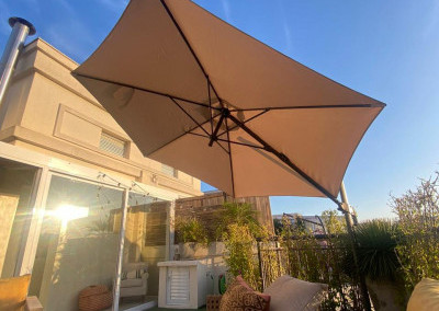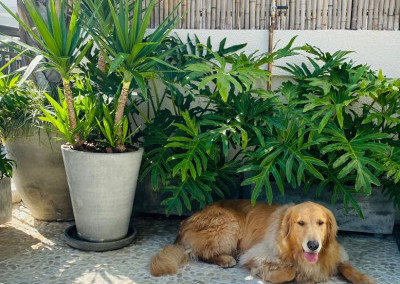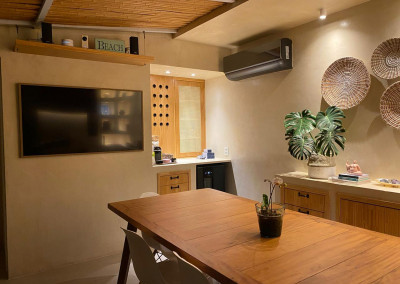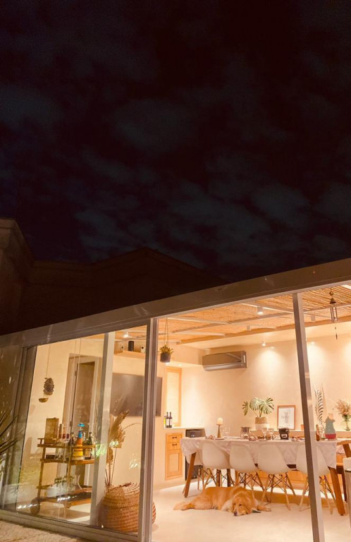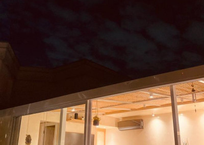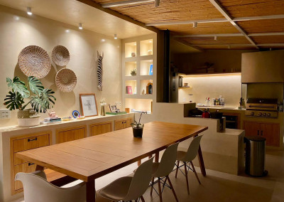 A cobertura do espaço é com fechamento parcial, com estrutura de aço, teto sob medida feito em bambu e vidro, e com portas de correr para a área externa.