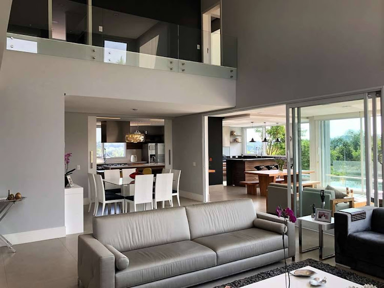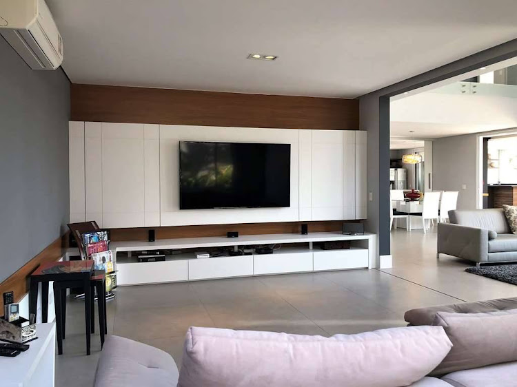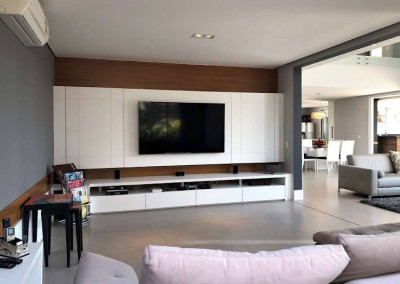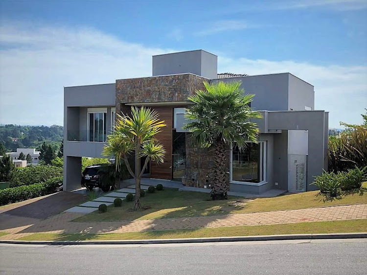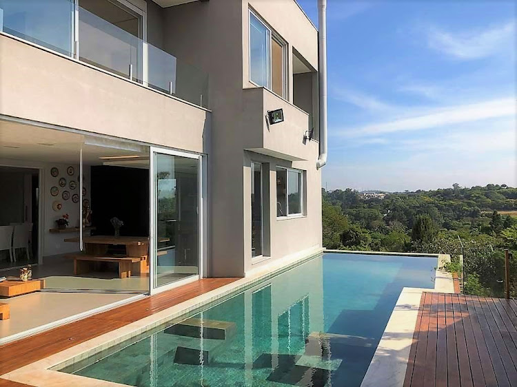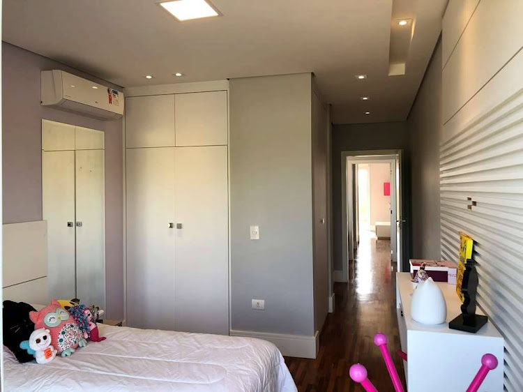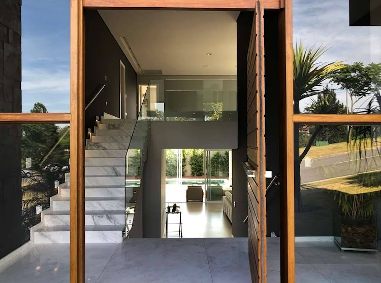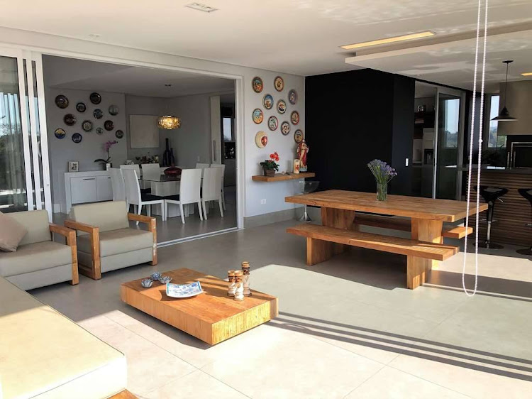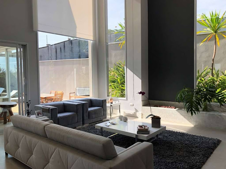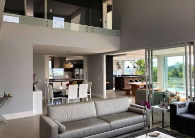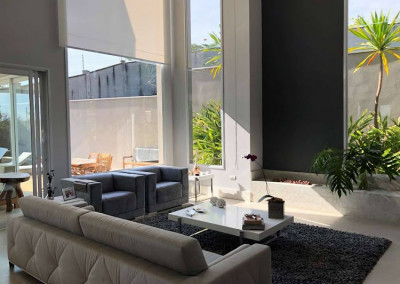 - Living com lareira e pé direito duplo, sala de estar com cortinas motorizadas, sala de jantar e sala de home theater com porta de correr.