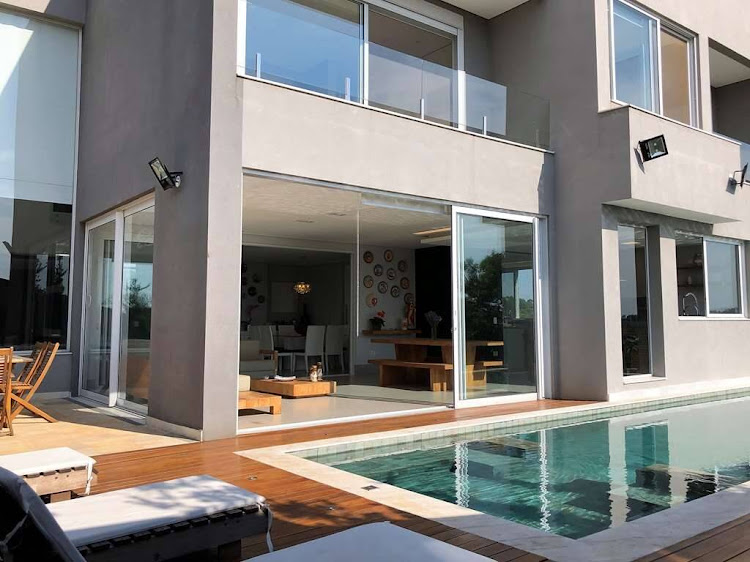 - Portão em inox e vidro que divide área da piscina.