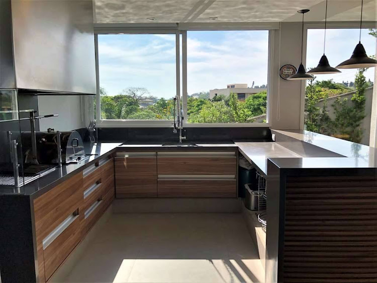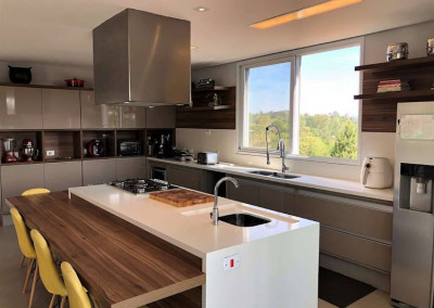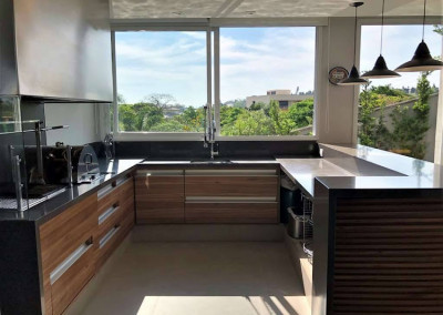 - Copa cozinha americana grande, toda planejada, envidraçada, com persianas, despensa e bancadas em sylestone. Ilha com bancada, pia iluminada, forno e fogão cook top 5 bocas Electrolux com coifa inox.