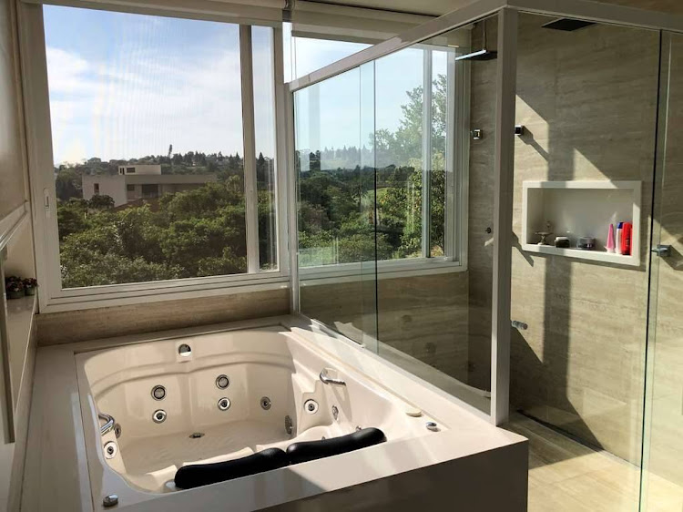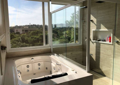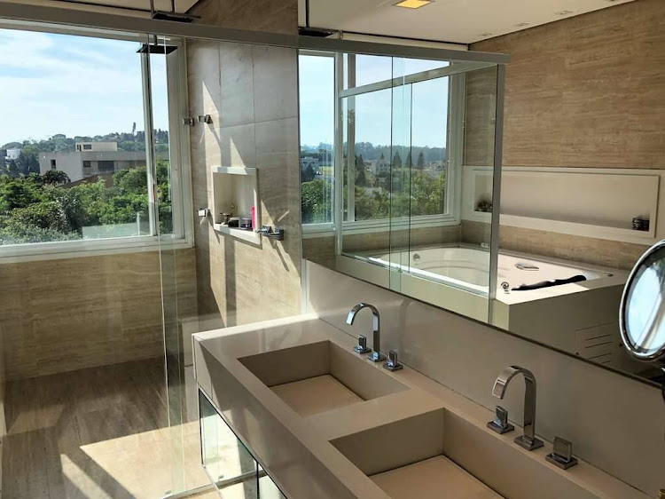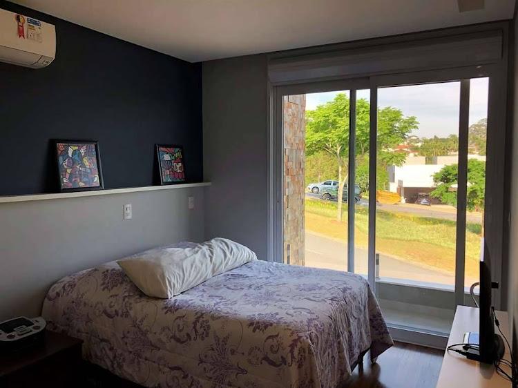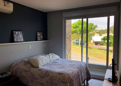 - Suíte master muito confortável, com sala de vestir e vista para área preservada. Banheiro panorâmico com penteadeira, hidro dupla, chuveiro com duas duchas de teto e pia com duas cubas.
