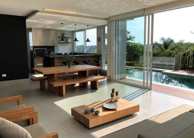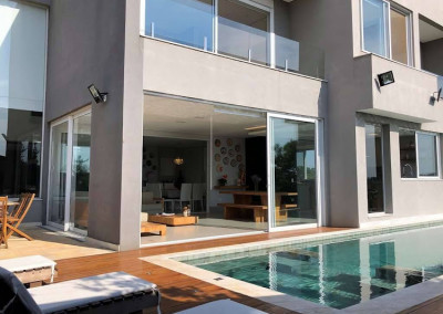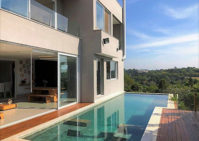 - Piscina em alvenaria (3,5m x 12m) com borda infinita e hidro, revestimento em Hijal (Indonésia), aquecimento (trocador de calor Bosch), iluminação interna, solarium com deck e ducha.