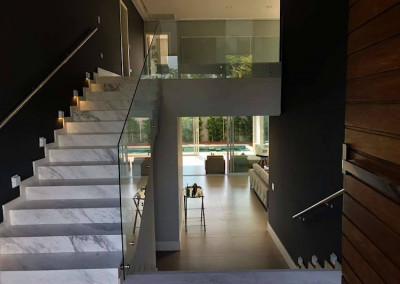 - Escada iluminada, em mármore Piguês branco, com guarda corpo de vidro e corrimão de metal.
