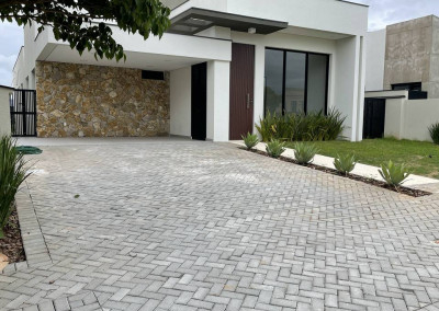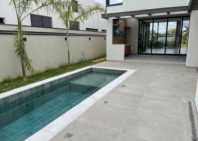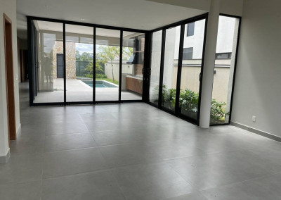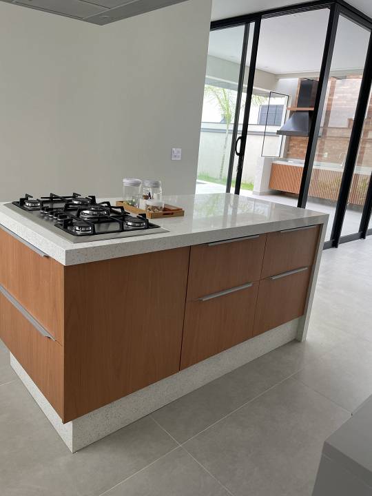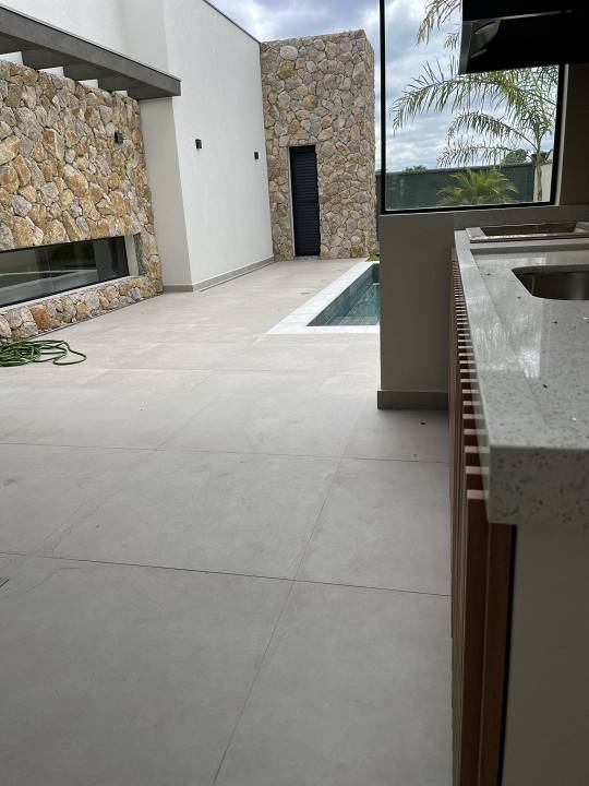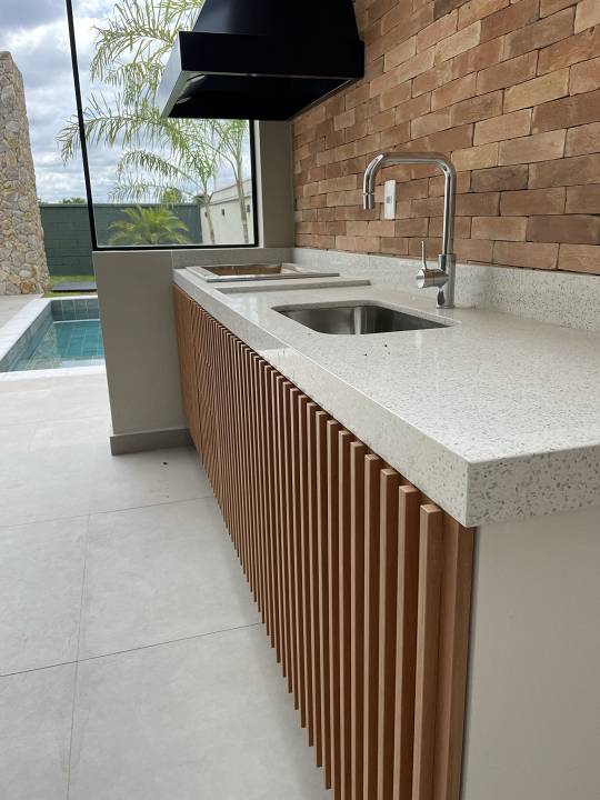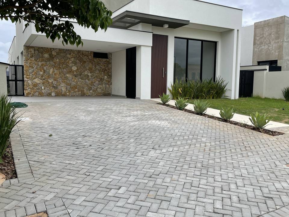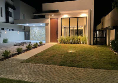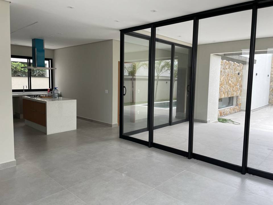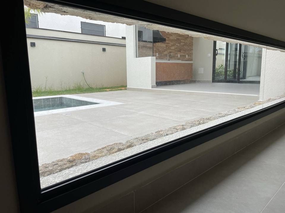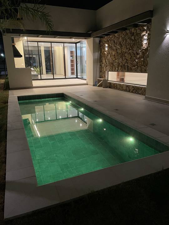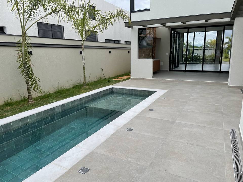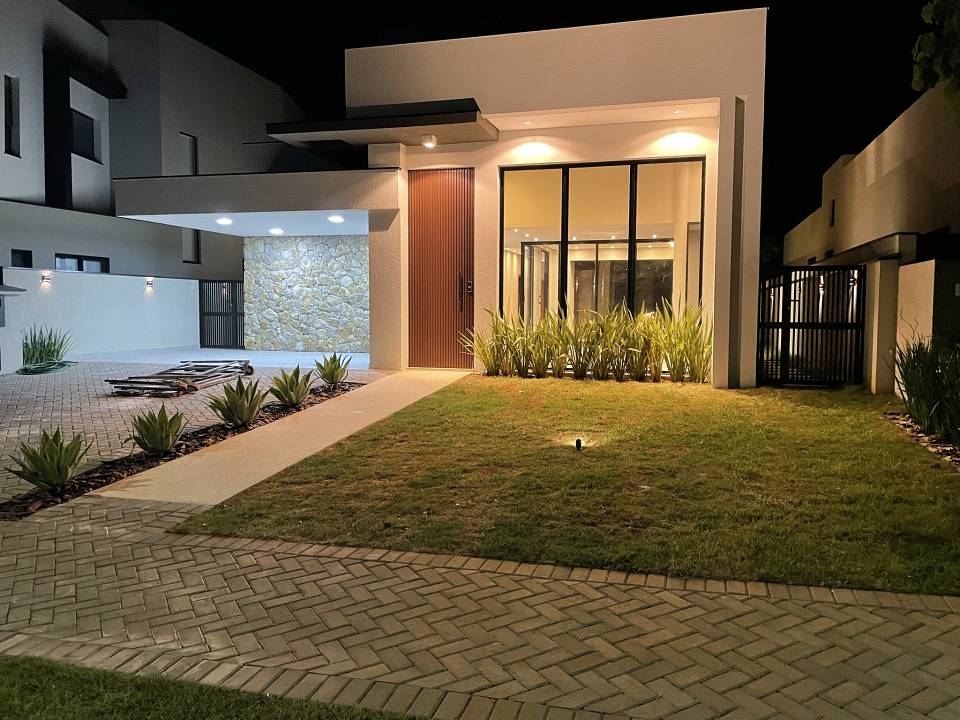 Casa térrea com 3 suítes com closet, projeto arquitetônico moderno e com excelente iluminação natural. Sala dois ambientes (pé direito alto) com cozinha integrada equipada com móveis planejados, cooktop e coifa, escritório, área gourmet com piscina e churrasqueira com coifa, lavabo moderno, banheiro na área da piscina, dois sistemas de aquecimento solar: um exclusivo para a casa e um exclusivo para piscina, todos os ambientes preparados para ar-condicionado, banheiros com cubas, bacias e metais DECA e bancada em PRIME, cozinha e gourmet com bancadas em QUARTZO, todos os pisos e revestimentos Portinari ou Portobello, projeto de iluminação, paisagismo completo, esquadrias AluVidro, garagem 4 vagas, sendo duas cobertas, melhor localização do condomínio.