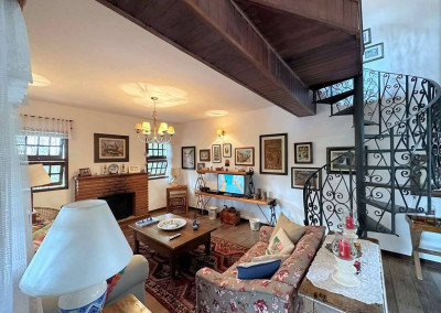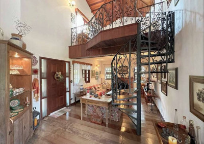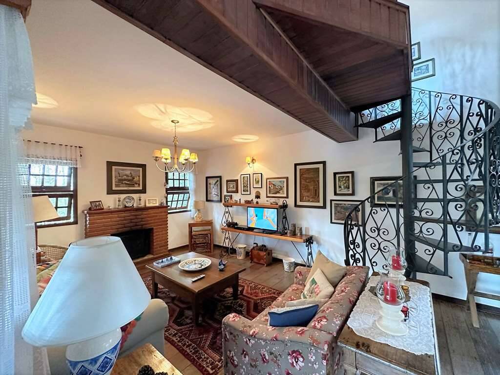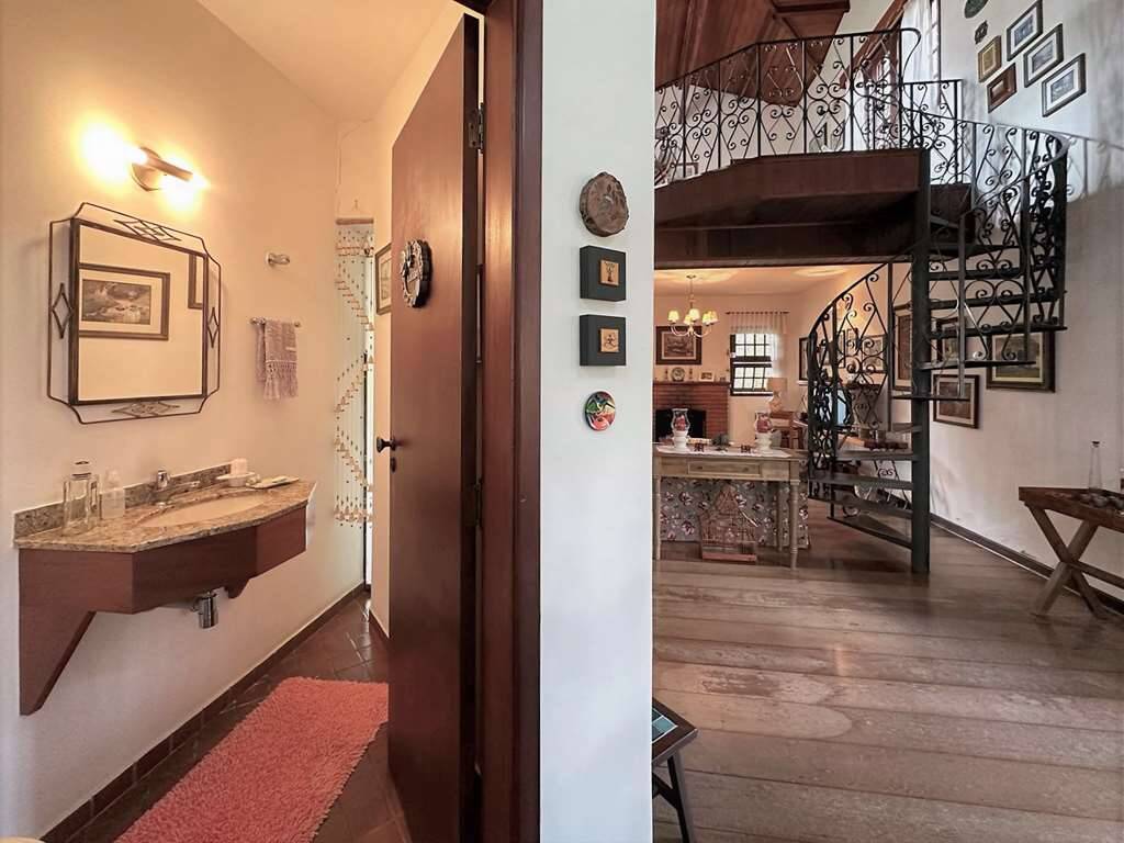 Mezanino com lareira, ideal para home office ou sala íntima.