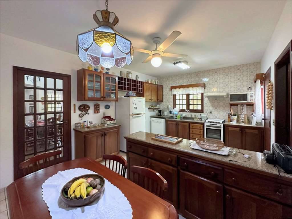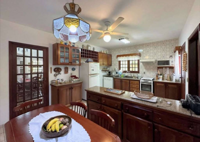 Cozinha totalmente equipada, com copa e repleta de armários planejados, em madeira maciça.