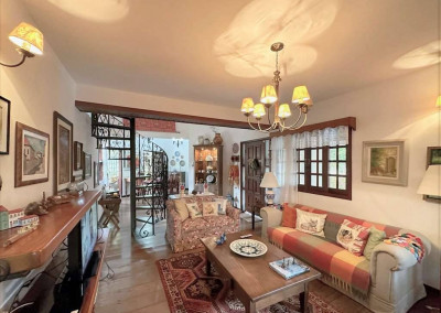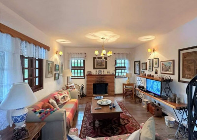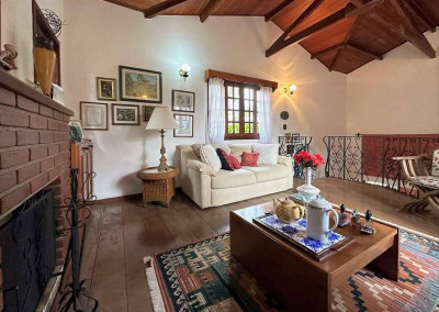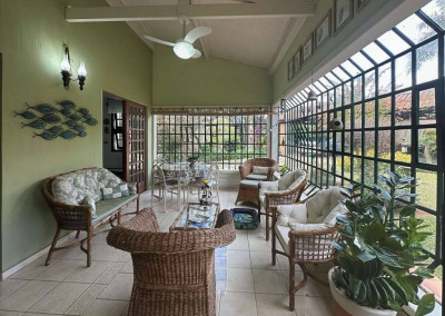 Living para três ambientes, com lareira e uma agradável varanda com fechamento em vidro, voltada para o jardim.