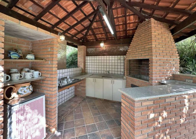 Espaço gourmet churrasqueira, pia, bancada em granito e um incrível fogão em aço inox.