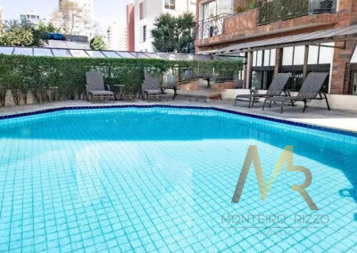 A estrutura do prédio conta com uma equipe competente e atenciosa de recepcionistas, manutenção, manobristas e camareiras que limpam o apartamento seis vezes por semana (uma por andar). Todos esse custos estão incluídos no condomínio. Há uma lavanderia com custo subsidiado que pode ser contratada a parte. O prédio possui piscina, deck/solário, academia, salão de festas com cozinha, sauna e quarto para massagens (com cama apropriada).