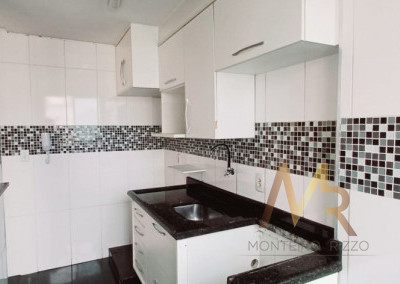 Apartamento com móveis planejados na cozinha e no banheiro. Dormitórios com guarda-roupas.