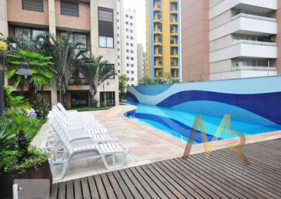 Área de lazer com piscina, churrasqueira, forno de pizza a lenha, salão de festa e academia.