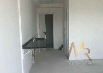 Charmoso Studio de 26 m², com cozinha americana integrada, banheiro moderno e sacada privativa. Unidade prática e funcional, sem vaga de garagem, ideal para quem busca praticidade e mobilidade.