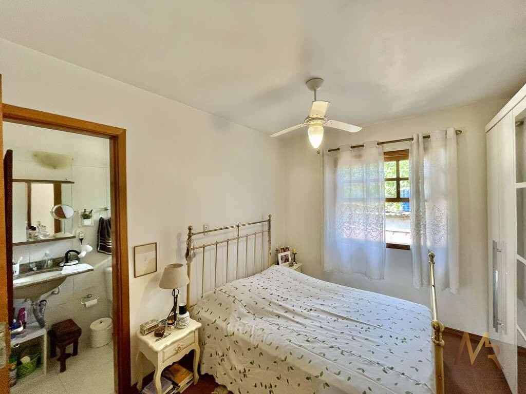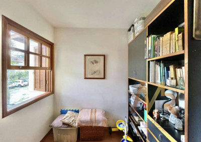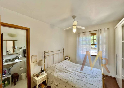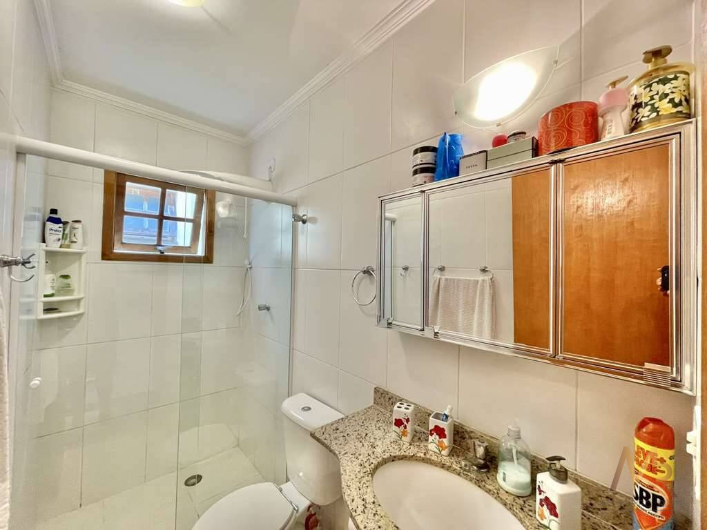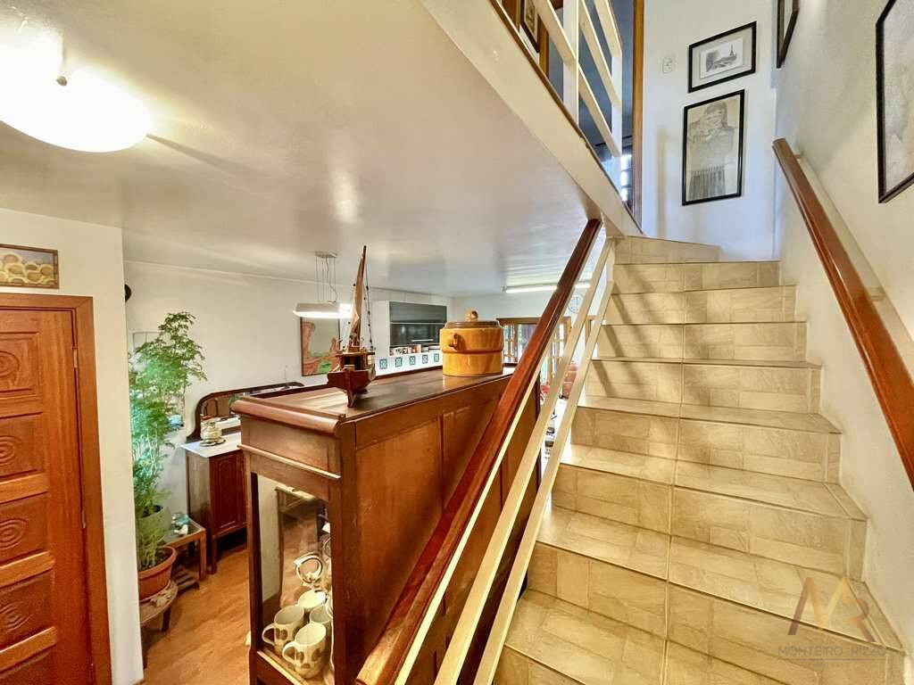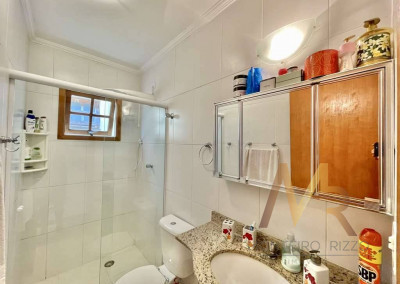 Acessado por uma sólida escada de alvenaria com guarda-corpo de ferro e corrimão de madeira, o piso superior reserva o refúgio íntimo da casa. São três dormitórios bem distribuídos, incluindo uma suíte master para garantir total privacidade. Dois dos quartos contam com armários modulares, e um deles presenteia os moradores com um charmoso terraço privativo. Os banheiros seguem o padrão de qualidade, equipados com tampos em granito, espelhos e elegantes boxes de vidro.