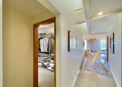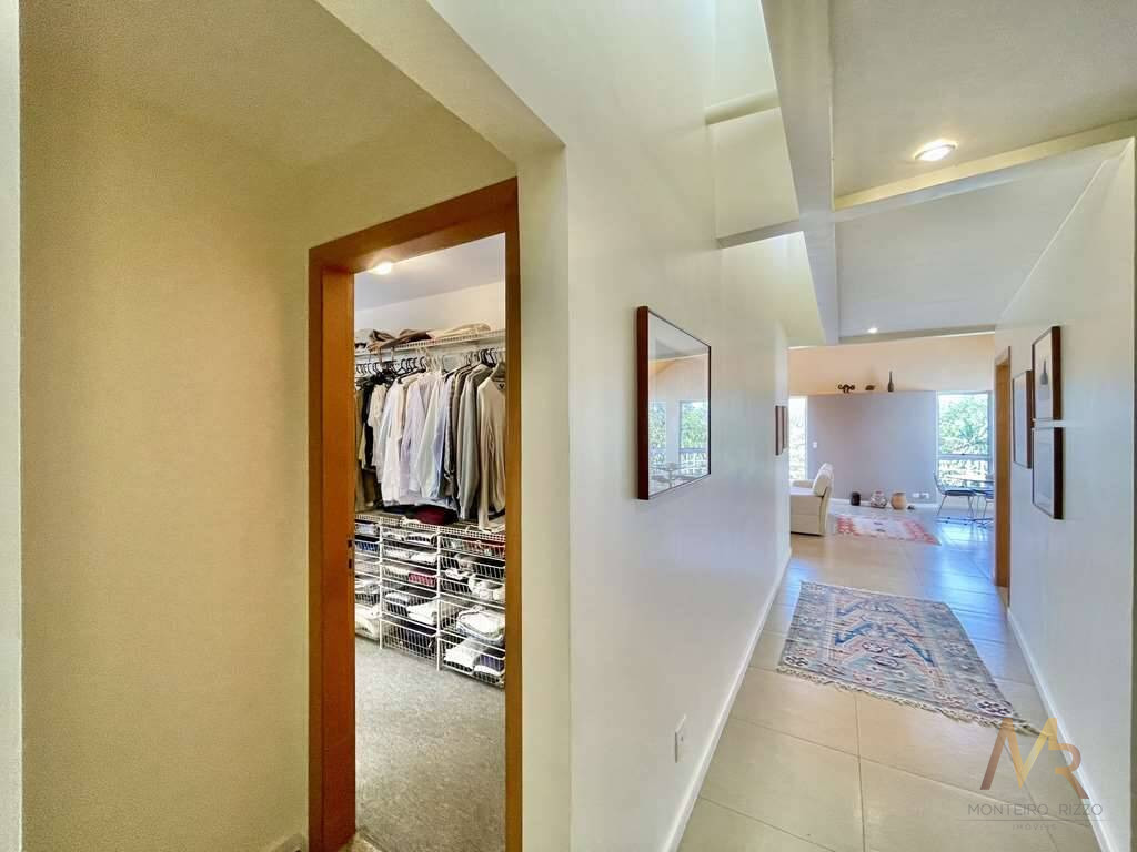 O hall de entrada social, com um lavabo e lavatório separado, distribui o acesso às áreas social e de serviço com grande funcionalidade. No térreo, um escritório bem iluminado oferece um espaço ideal para o trabalho, convenientemente localizado ao lado da suíte master. O living, projetado para três ambientes distintos — jantar, estar com lareira e TV —, se abre para um terraço com uma vista maravilhosa, criando o cenário perfeito para relaxar e receber. A suíte master, também no térreo, é um refúgio de conforto com closet, roupeiro e um banheiro equipado com duas cubas e box de vidro.