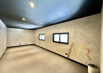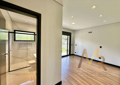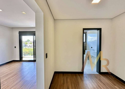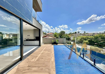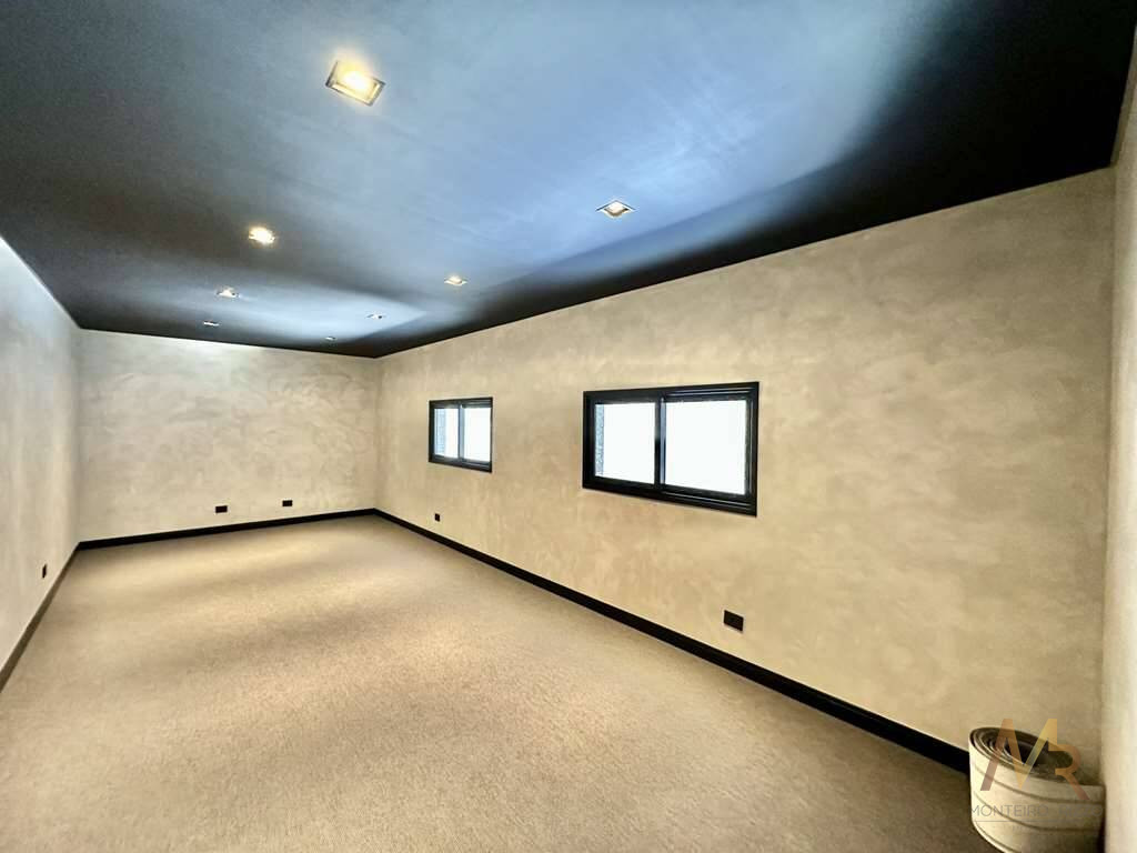 No piso superior, um hall íntimo distribui o acesso às quatro suítes, todas preparadas para ar-condicionado, sendo duas com terraços e a master com um espaçoso closet e um banheiro com duas cubas e banheira. Um escritório e um family room, ideal para um home theater mais reservado, completam a área privativa. A casa ainda oferece um salão multiuso projetado para ser uma sala de cinema, perfeito também para academia ou estúdio, e um vestiário de apoio.