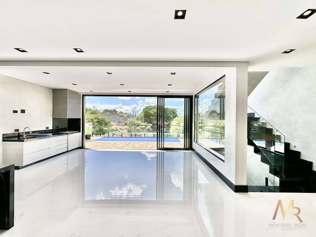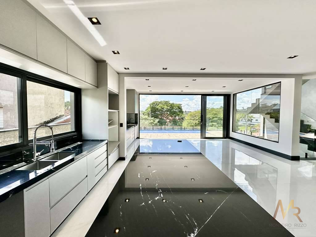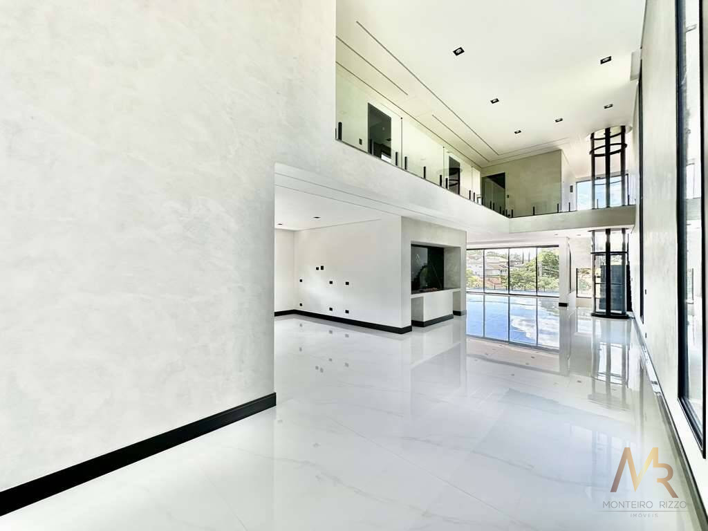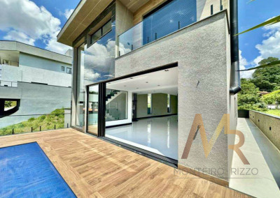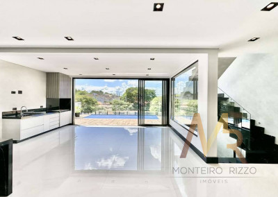 A propriedade, que se beneficia de dois acessos por ruas distintas, recebe os visitantes através de imponentes portas pivotantes com fechaduras eletrônicas, tanto no acesso social quanto no da garagem. Envidraçada e ensolarada, a casa é um santuário de luz e ventilação natural. O living integrado para cinco ambientes, em parte com pé direito duplo, é o coração da residência, unindo estar com lareira a gás, jantar, almoço, bar e um espaço gourmet com churrasqueira. A cozinha planejada, com ilha e bancadas elegantes, flui perfeitamente para este espaço social, que por sua vez se abre para a piscina com solarium e uma vista deslumbrante.