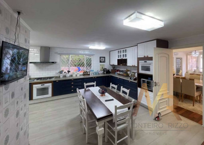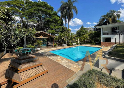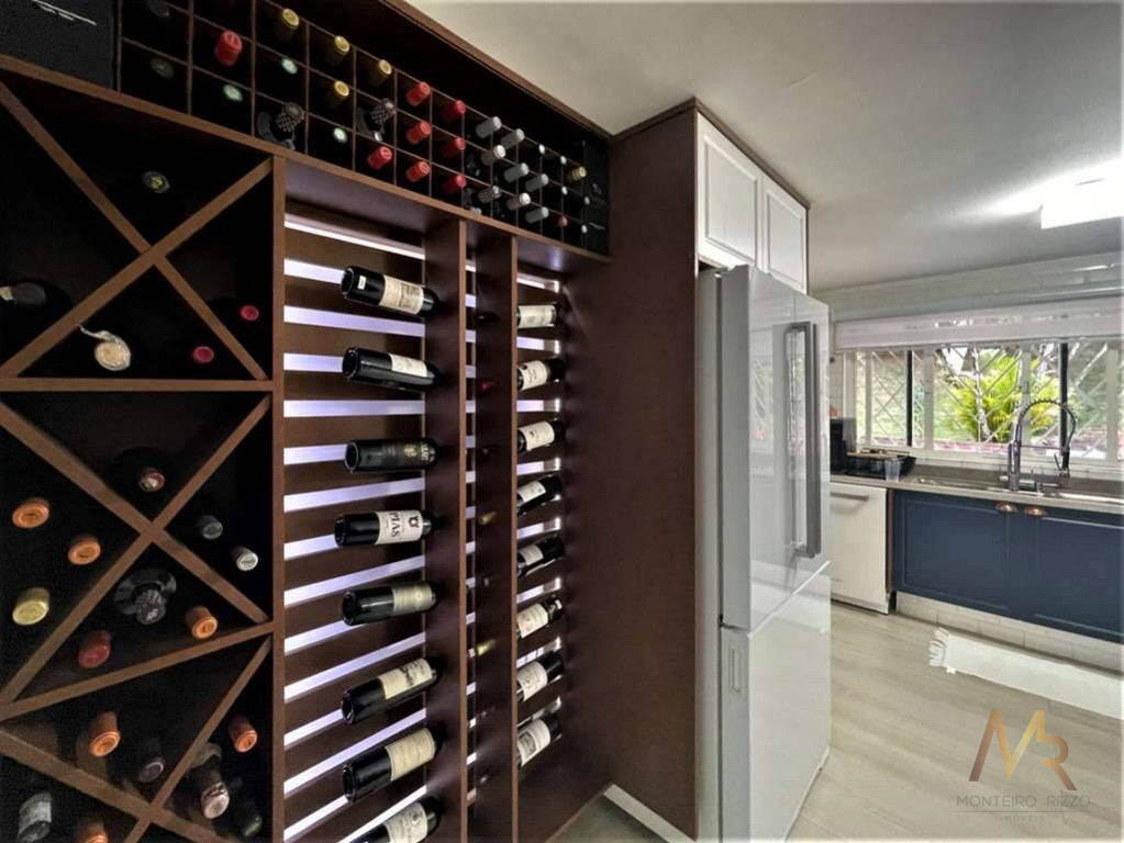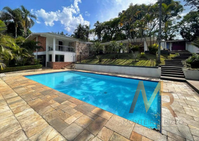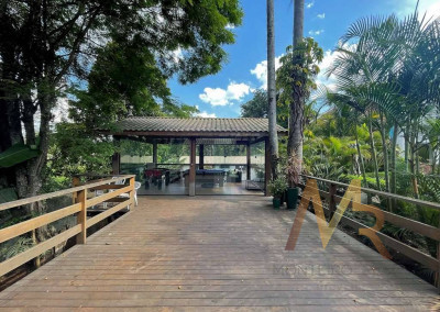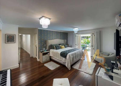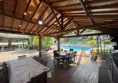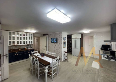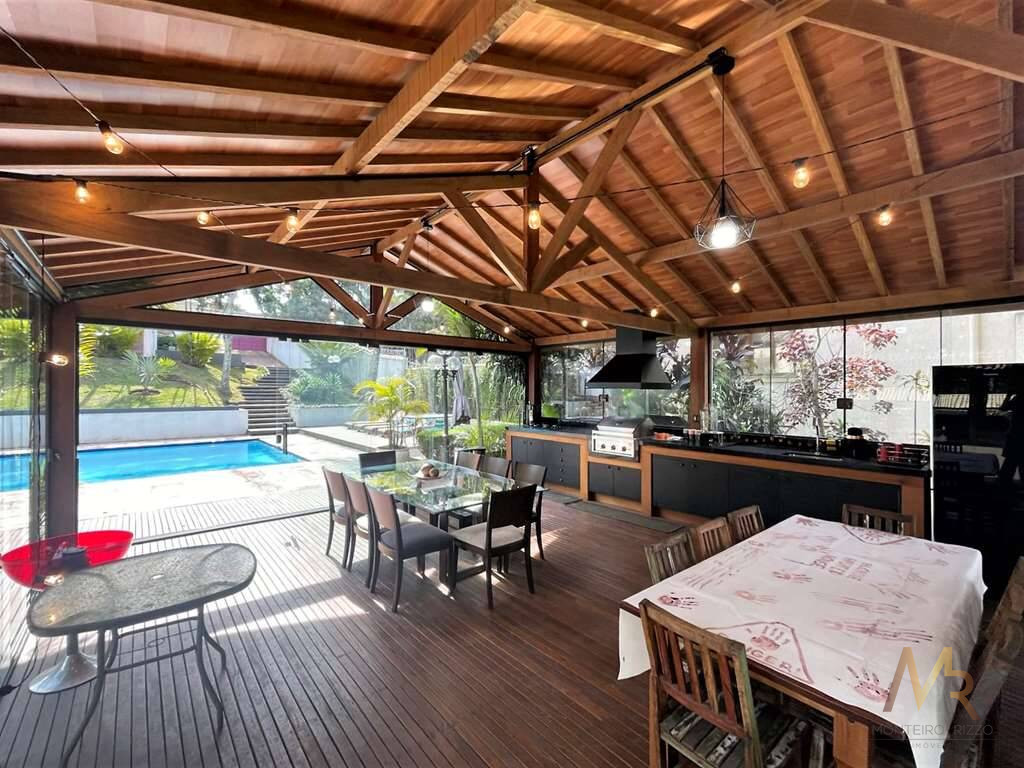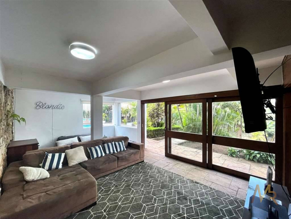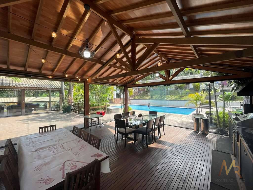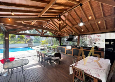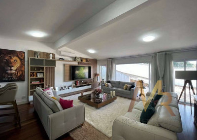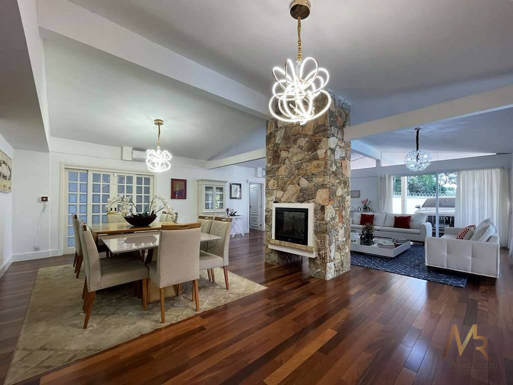 O living para cinco ambientes integra-se harmoniosamente a uma varanda em "L" e ao quintal, conectando as áreas de estar, lareira elétrica, jantar e um family room com home theater e adega. A casa dispõe de quatro dormitórios, sendo três suítes, com destaque para a suíte master de 70m² que inclui sala de vestir e uma sala de banho com hidromassagem dupla panorâmica. A área de lazer é um verdadeiro resort particular, com dois espaços gourmet distintos, piscina de 50m², salão de festas e de jogos, além de um anexo com SPA, sauna e vestiário. A propriedade ainda conta com uma casa de hóspedes ou caseiro, galinheiro, horta e garagem para seis veículos, tudo em um terreno com paisagismo formado e árvores frutíferas.