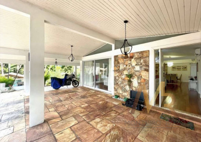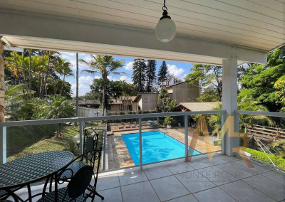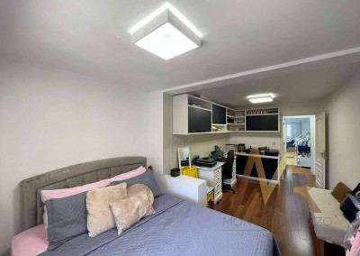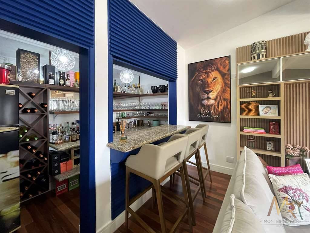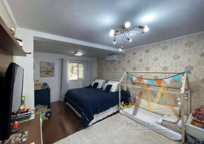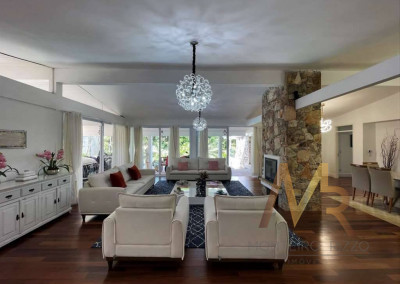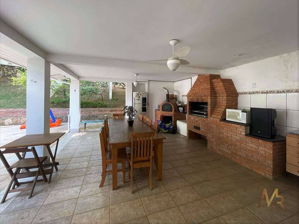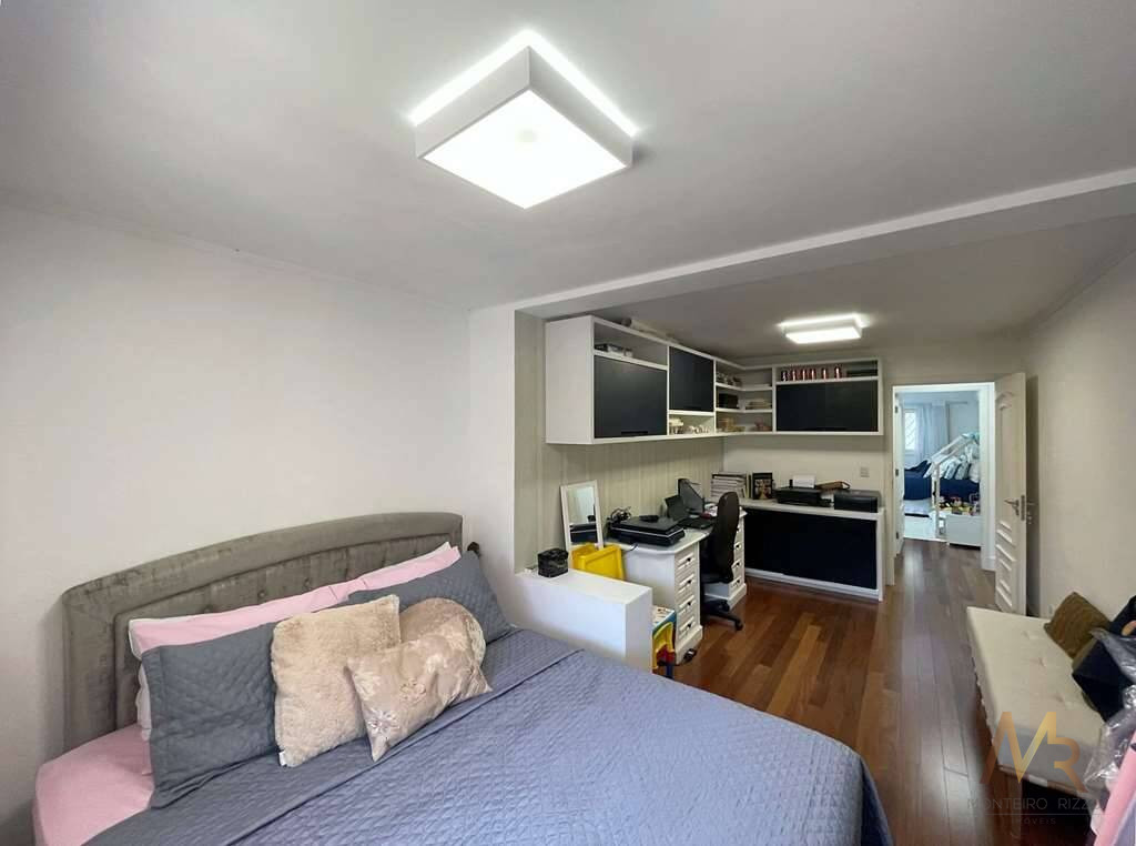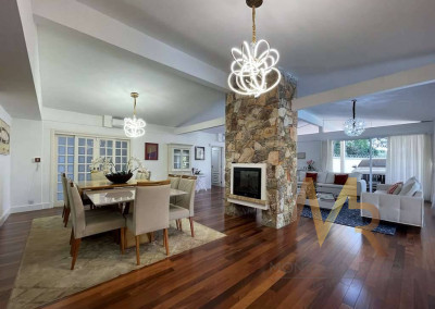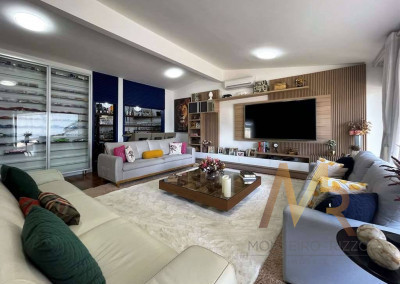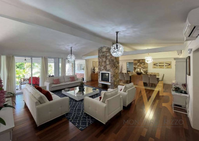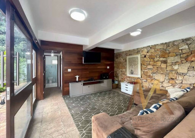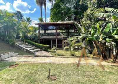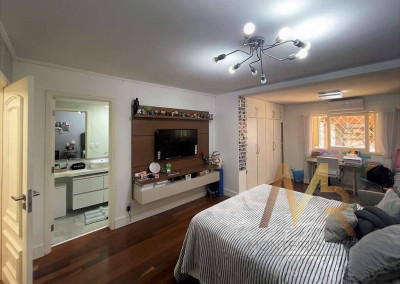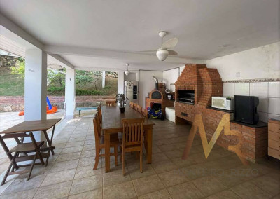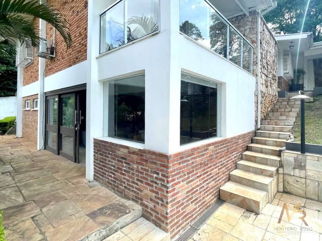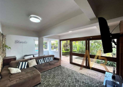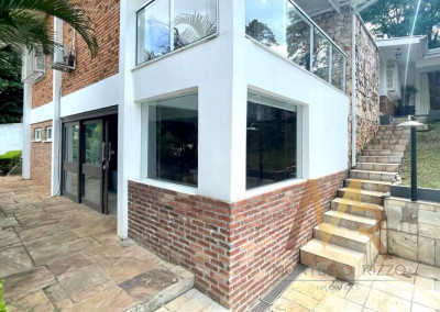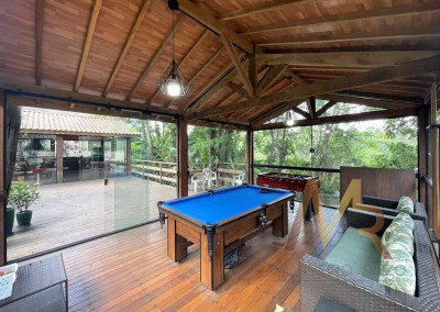 O living para cinco ambientes integra-se harmoniosamente a uma varanda em "L" e ao quintal, conectando as áreas de estar, lareira elétrica, jantar e um family room com home theater e adega. A casa dispõe de quatro dormitórios, sendo três suítes, com destaque para a suíte master de 70m² que inclui sala de vestir e uma sala de banho com hidromassagem dupla panorâmica. A área de lazer é um verdadeiro resort particular, com dois espaços gourmet distintos, piscina de 50m², salão de festas e de jogos, além de um anexo com SPA, sauna e vestiário. A propriedade ainda conta com uma casa de hóspedes ou caseiro, galinheiro, horta e garagem para seis veículos, tudo em um terreno com paisagismo formado e árvores frutíferas.
