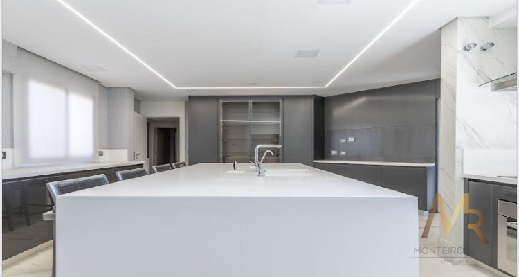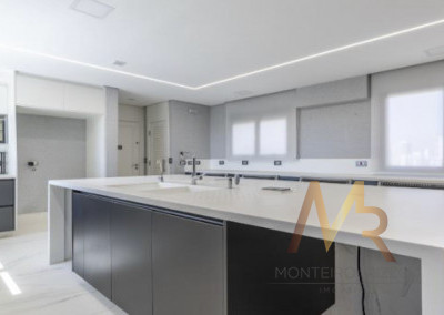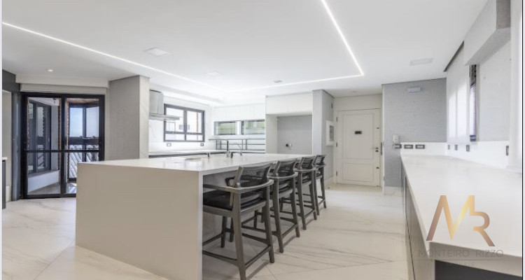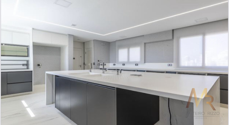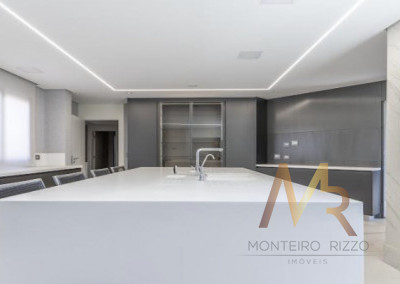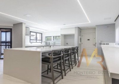 Piso em porcelanato 1,5 x 1,5 m, papel de parede; cortinas rolô; ilha, pia e bancadas em Corian braco; armários e cristaleira da Florense em tom grafite perolizado; cooktop de indução Electrolux; forno elétrico e micro-ondas da linha Brastemp Gourmet (instalação pra forno a gás existente); coifa customizada da Turbo Ar; triturador, filtro purificador para água e dosador de detergente na bancada da pia; e despensa
