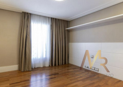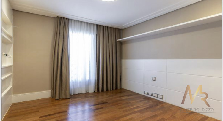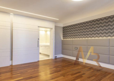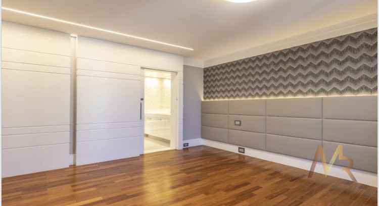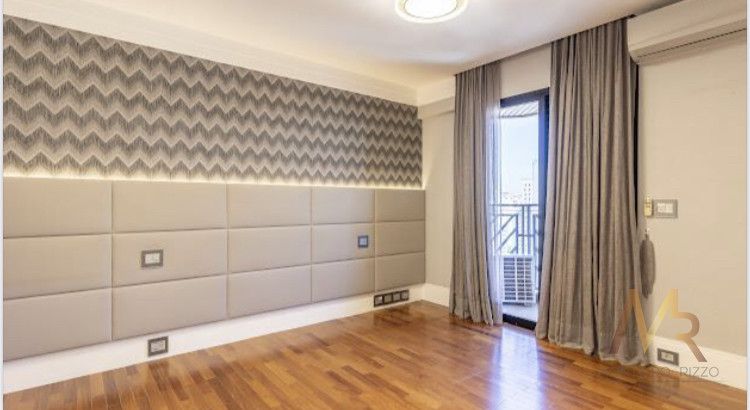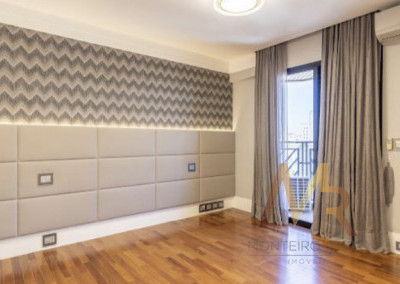 Piso em madeira, papel de parede, cortina, lustre, armário da Artigiano, painel de madeira feito por marcenaria especializada, cabeceira em laca