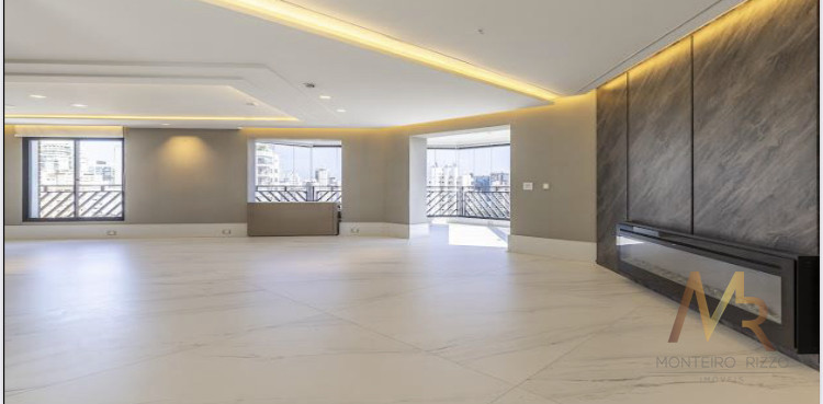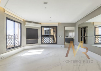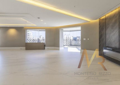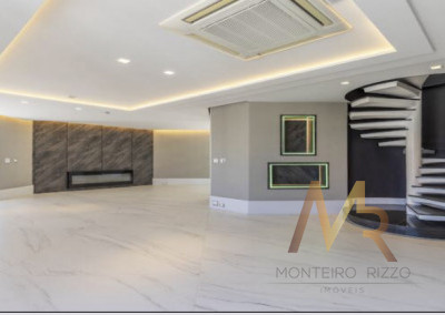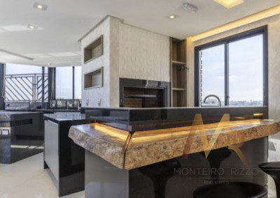 Piso em porcelanato 1,5 x 1,5 m, papel de parede, cortinas rolô, lareira elétrica, painel de madeira da Florense, 2 aparelhos de ar condicionado (1 split LG e 1 cassete Fujitsu); aparador em mármore marrom imperial para bar