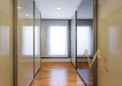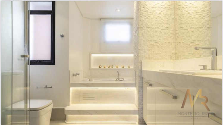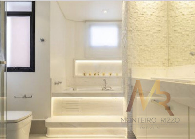 Banhos: pisos em porcelanato, box piso teto, ampla bancadas da pia em mármore branco pigues, espelhos com desembaçador, banheira com hidro e detalhes de acabamento em mármore no banho senhora, armários da Artigiano
