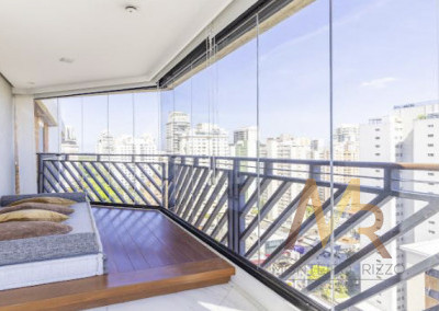 Piso em porcelanato 1,5 x 1,5 m, papel de parede, cortinas rolô, deck em madeira com futton e almofadas, aparador em laca fendi brilhante separando o terraço da sala, cozinha gourtmet com terraço