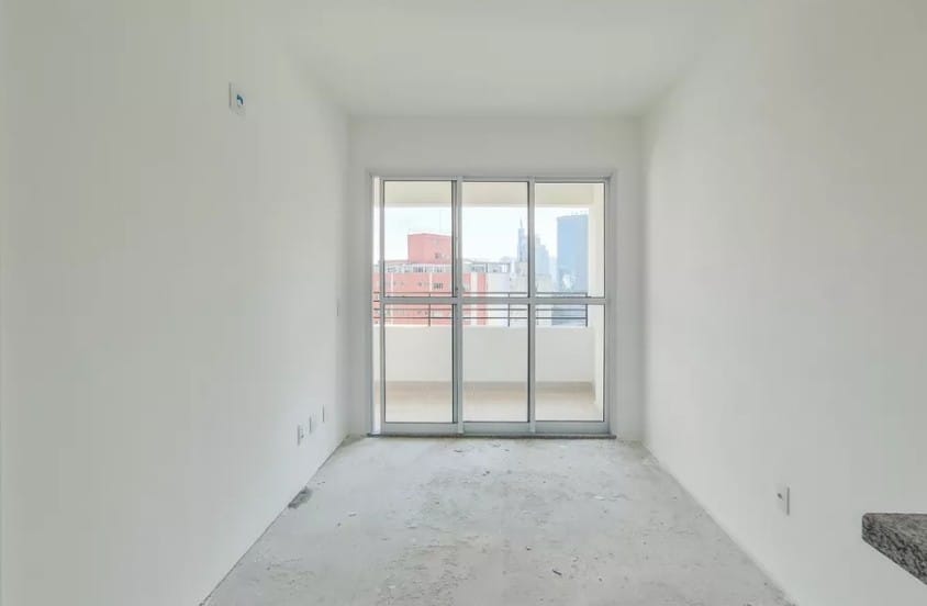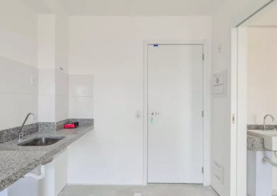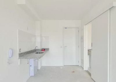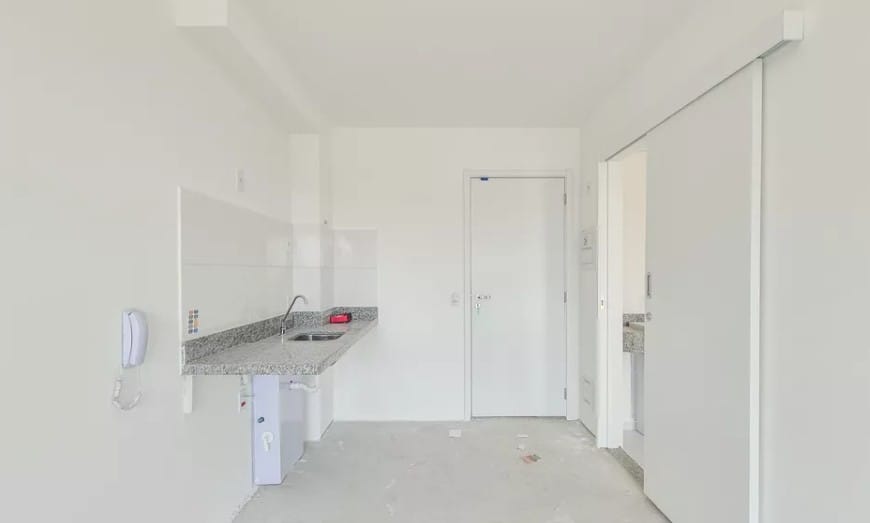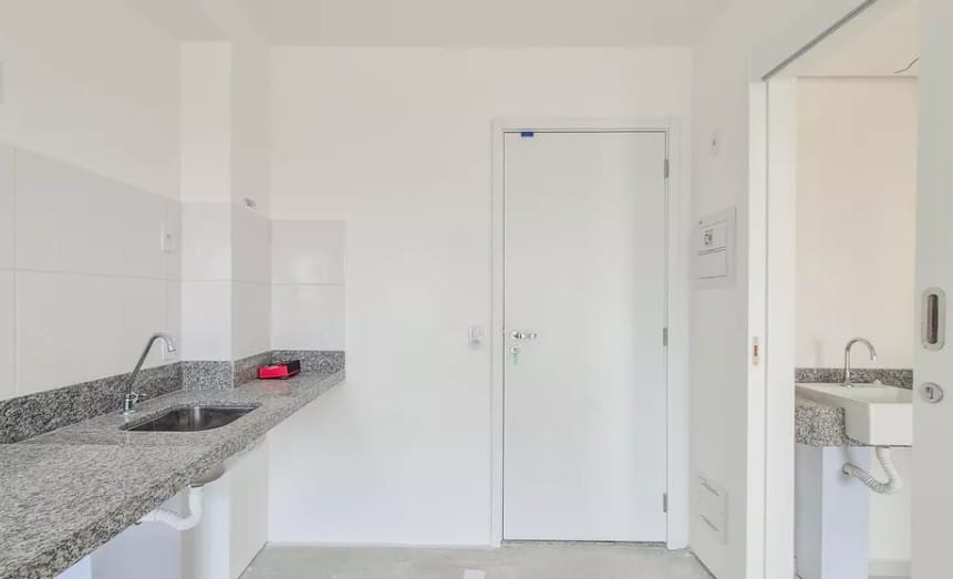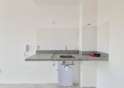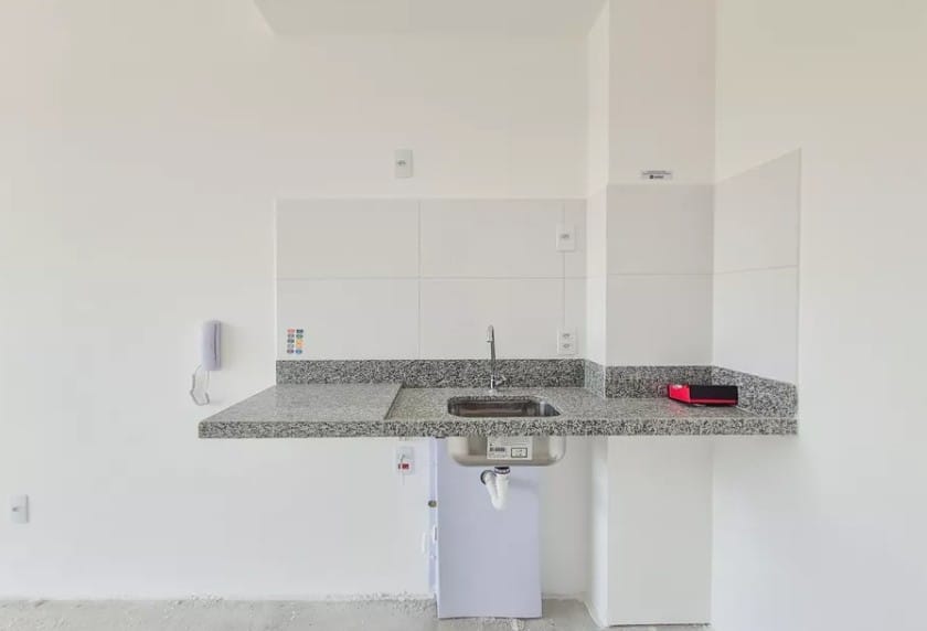 * Sala integrada à cozinha, com bancada e pia instaladas;