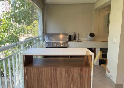 Varanda gourmet envidraçada com churrasqueira a gás e som ambiente