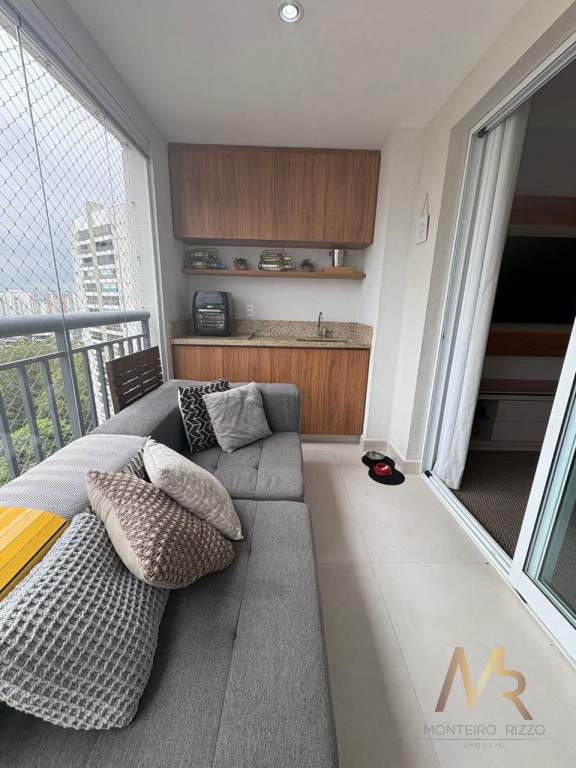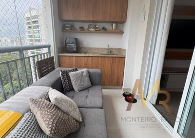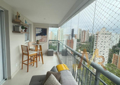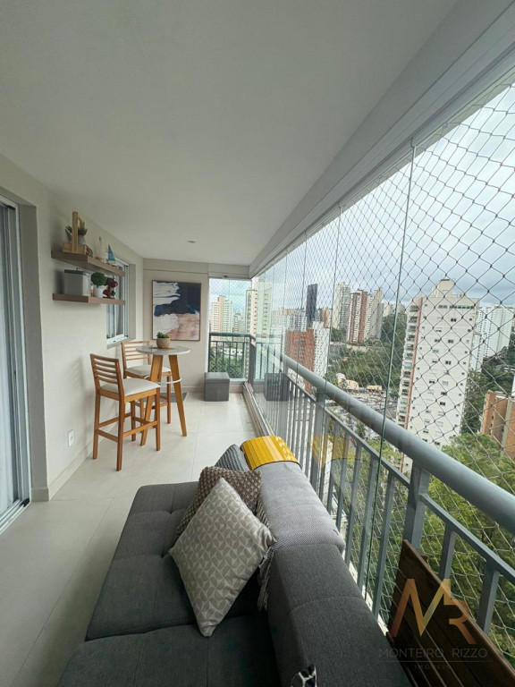 Apartamento no Morumbi com 2 suítes e 2 vagas de garagem, amplo terraço com fechamento em vidro e linda vista em andar altíssimo, living amplo e com lavabo, cozinha integrada, piso em madeira, três banheiros, está repleto de armários, ótimo acabamento de piso e revestimentos.