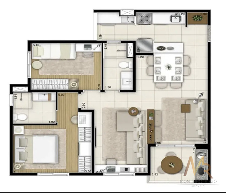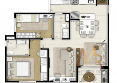 * 3 dormitórios (sendo 1 suíte, 1 quarto e 1 escritório – dormitório ampliado para integração com a sala)