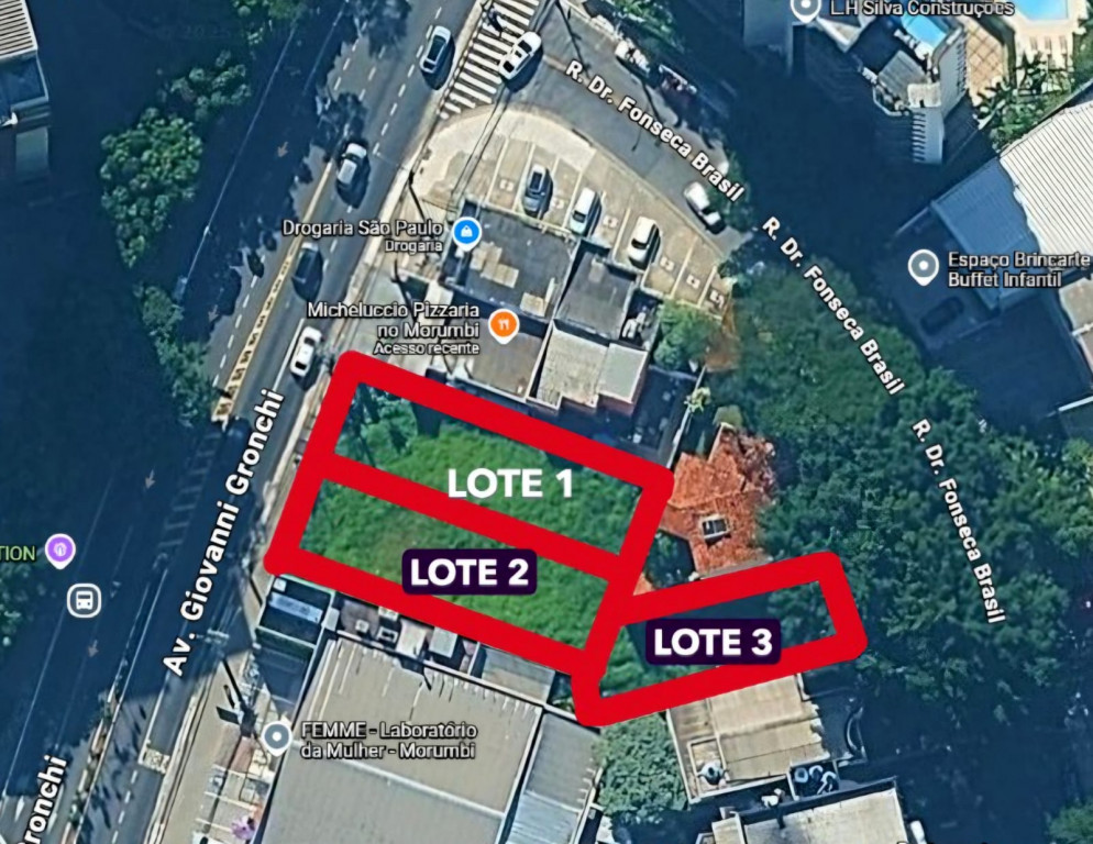 Em relação à Av. Giovanni Gronchi temos 02 lotes paralelos, medindo aproximado 10 m x 30 m cada, perfazendo um lote maior de 20 m x 30 m com área total de 600m2.