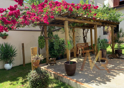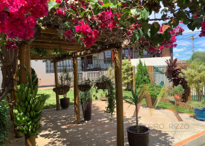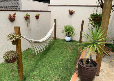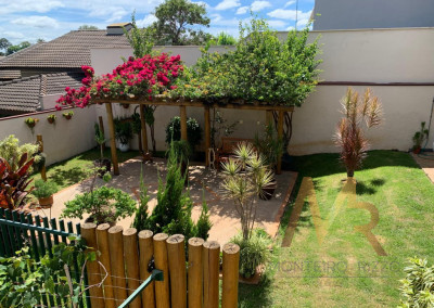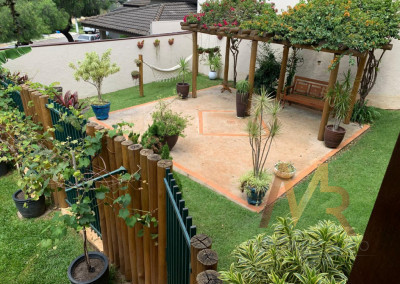 • Área verde junto ao espaço Gourmet, gramada, ajardinada, com pergolado e árvores frutíferas;