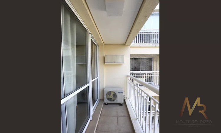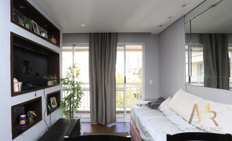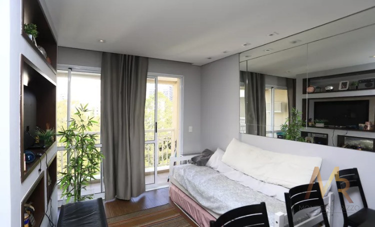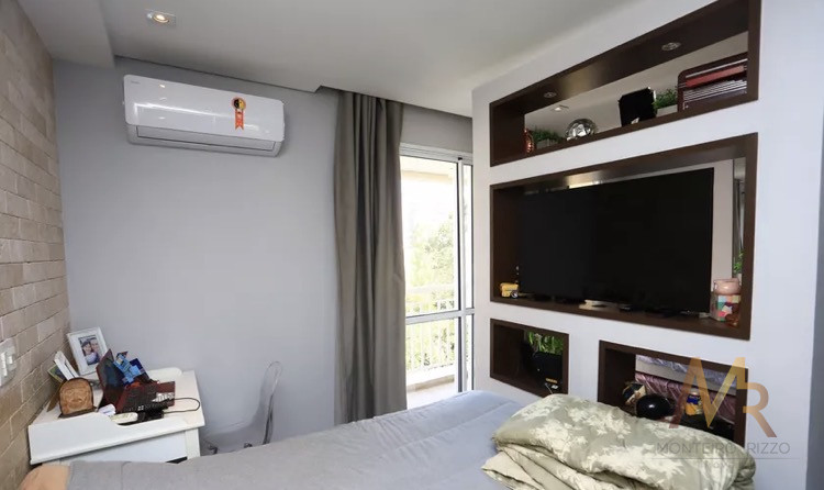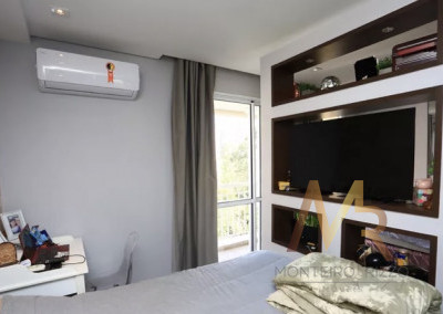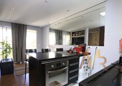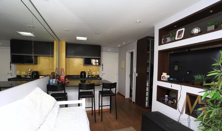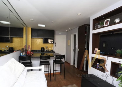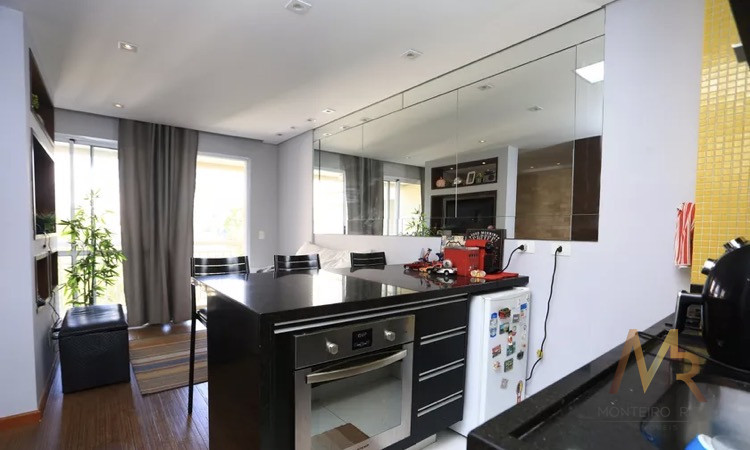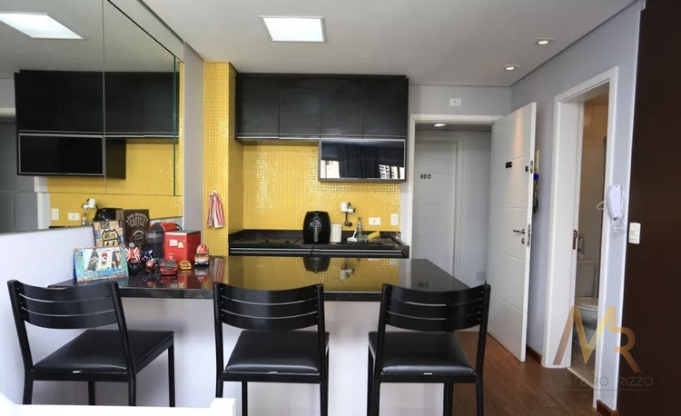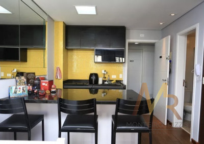 Conta com armários planejados com espelho, ar-condicionado 12.000 BTUs, cooktop de indução, geladeira (93 L), forno elétrico Brastemp, mesa de jantar em granito para até 4 pessoas, banquetas Tok&Stok e cama box com colchão.