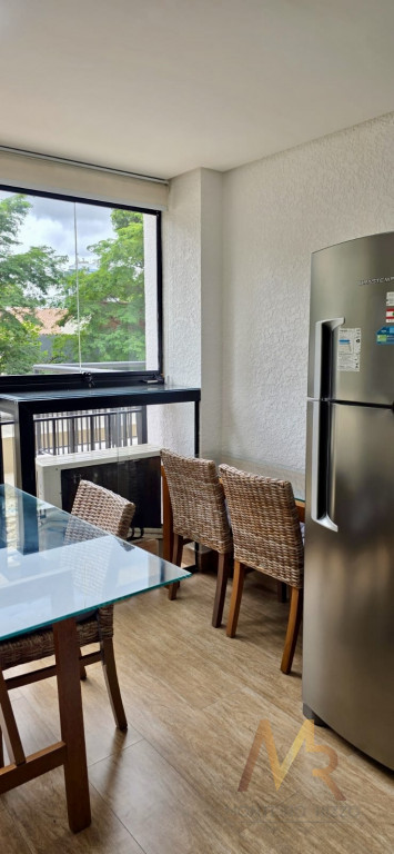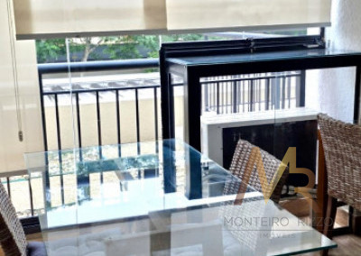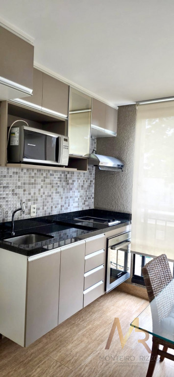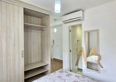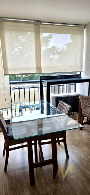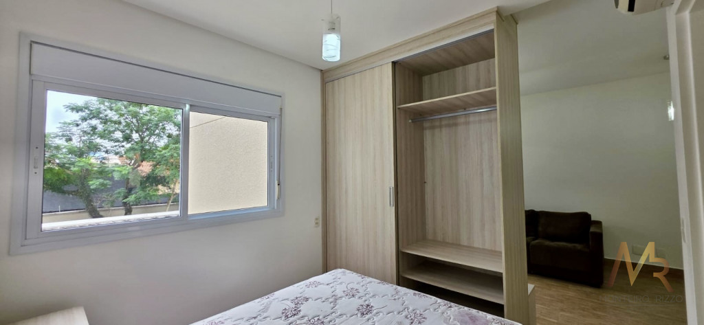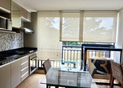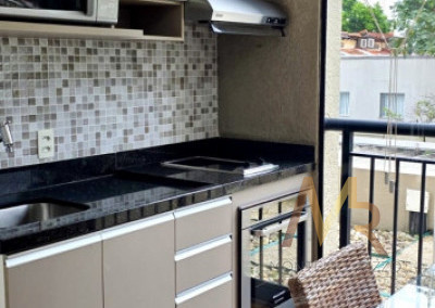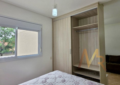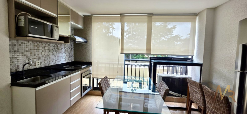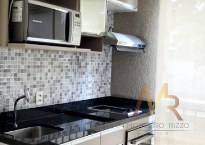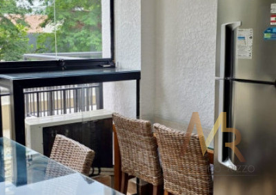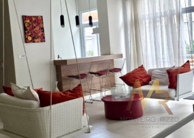 Sala com sofá 3 lugares, rack para TV, poltrona para leitura, dormitório completo com cama de casal e armários planejados, ar-condicionado, banheiro completo, copa completa com mesa de jantar, geladeira, armários planejados, Cooktop, forno, micro-ondas, aparador e Exaustor.
