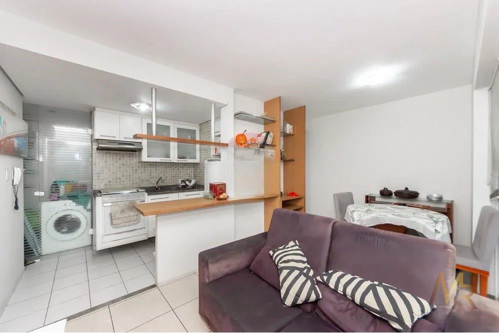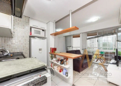 O apartamento possui cozinha com armários embutidos e lavanderia anexa, com separação com porta de vidro transparente.