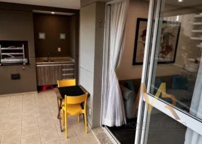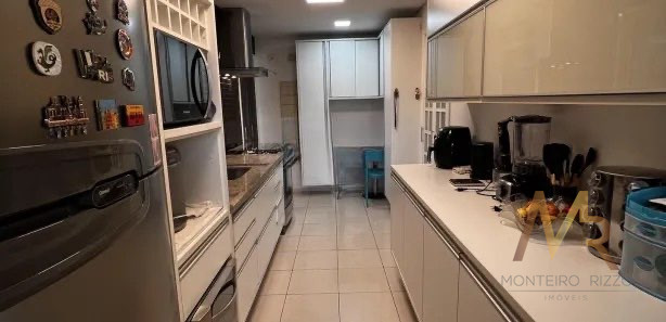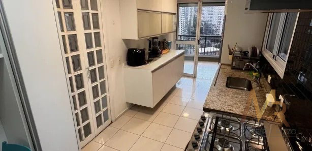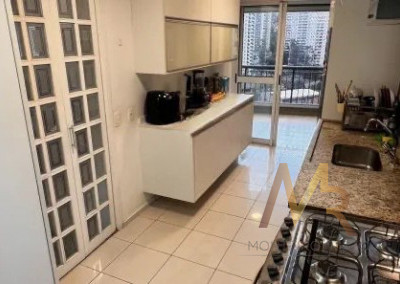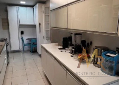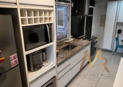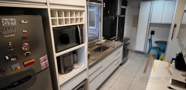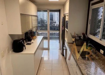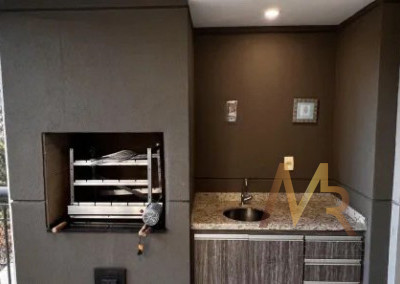 A cozinha possui acesso direto à varanda gourmet, criando uma integração funcional para quem gosta de cozinhar e receber, sem ser uma planta aberta para a sala, preservando independência entre os ambientes.