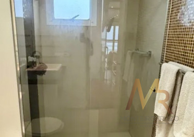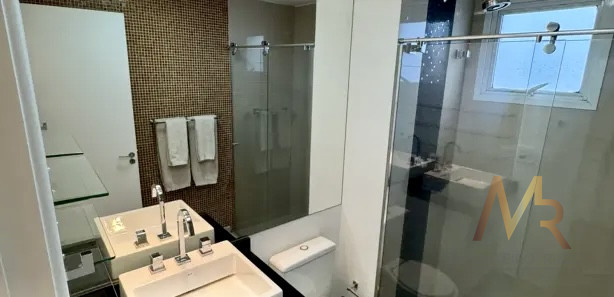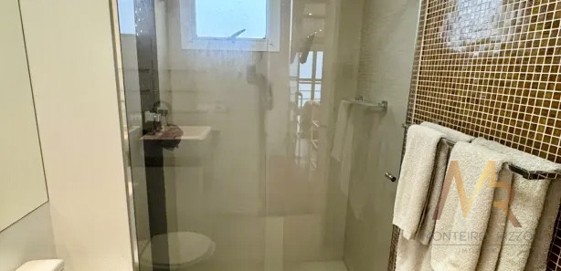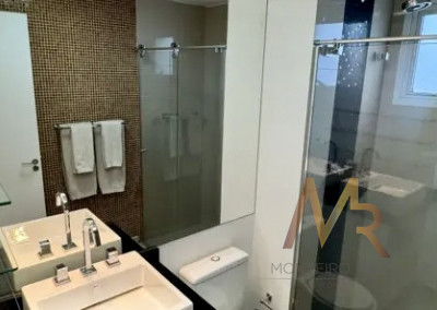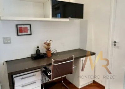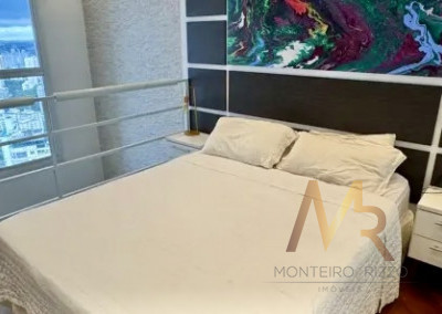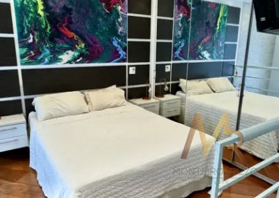 LAYOUT: Cama Queen size, cofre, 1 banheiro completo + 1 lavabo e mesa para home office.