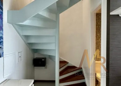 ACABAMENTOS: Piso superior e escada em assoalho de Ipê; áreas frias em porcelanato.