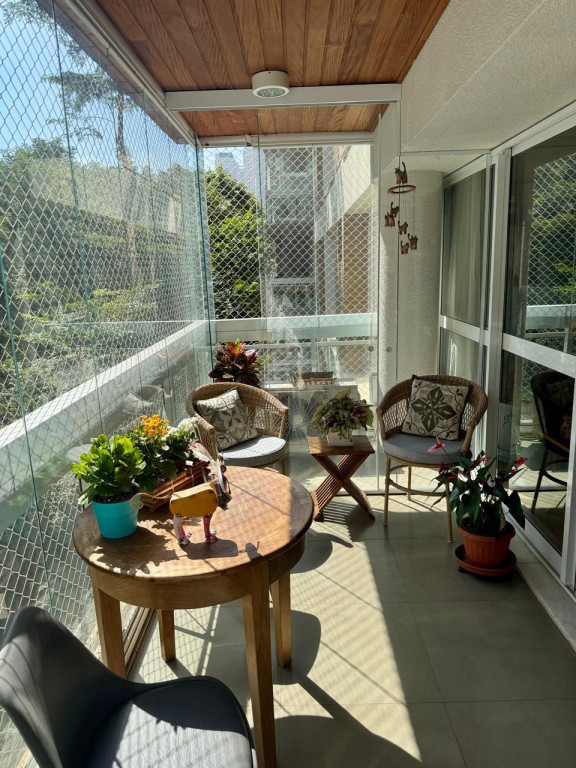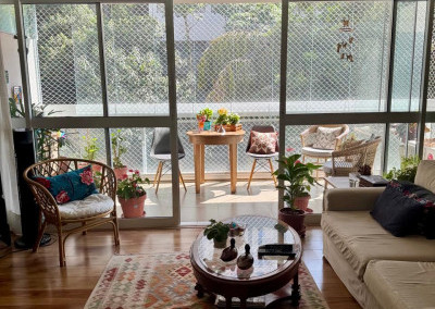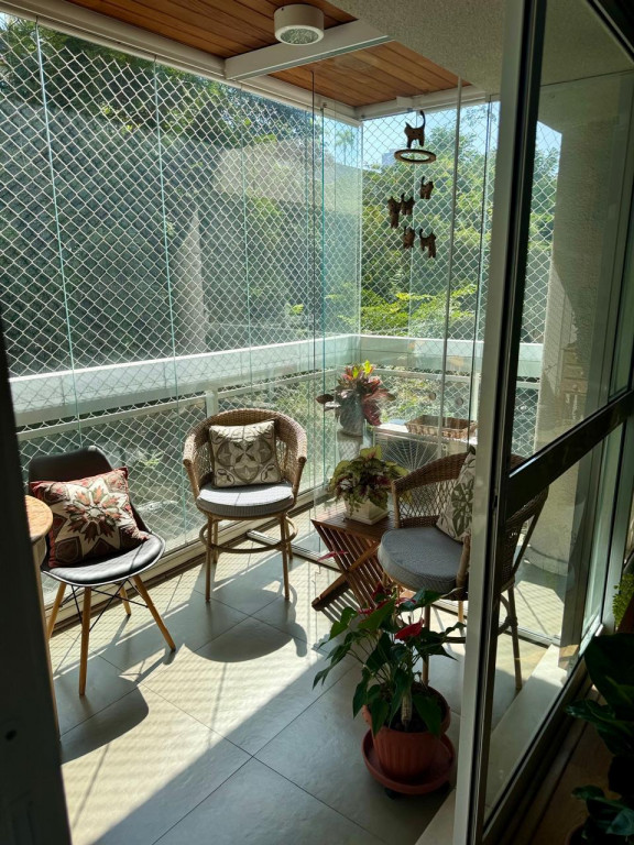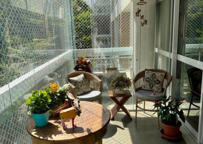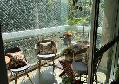 Na área social, uma varanda ampla e toda fechada em vidros, convida a momentos de lazer e descanso.