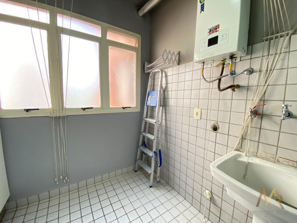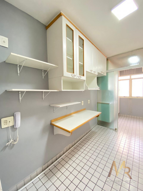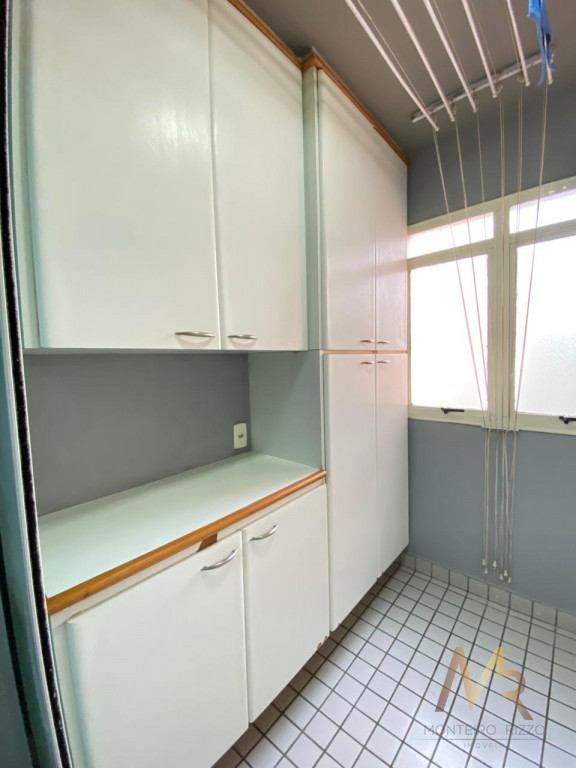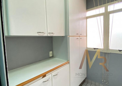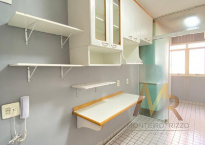 Cozinha e lavanderia com armários planejados e bem ventilada.