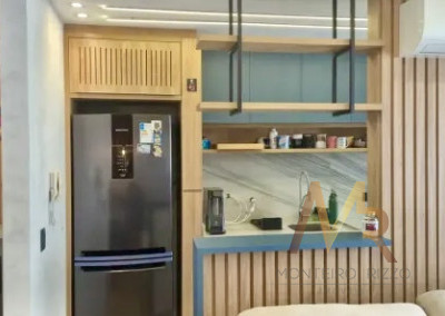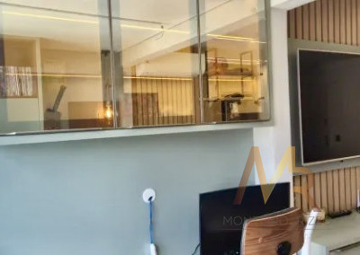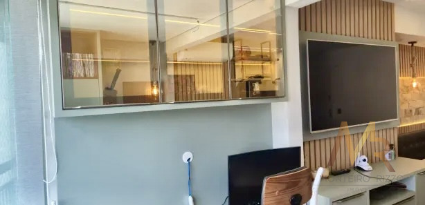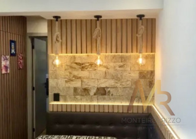 Marcenaria de Alto Padrão: Ambientes repletos de móveis planejados sob medida, com destaque para os painéis ripados que conferem um design contemporâneo e sofisticado.